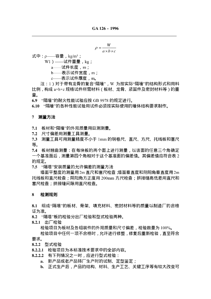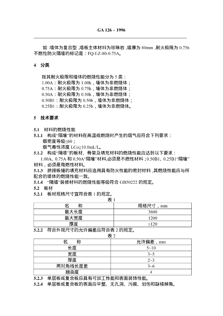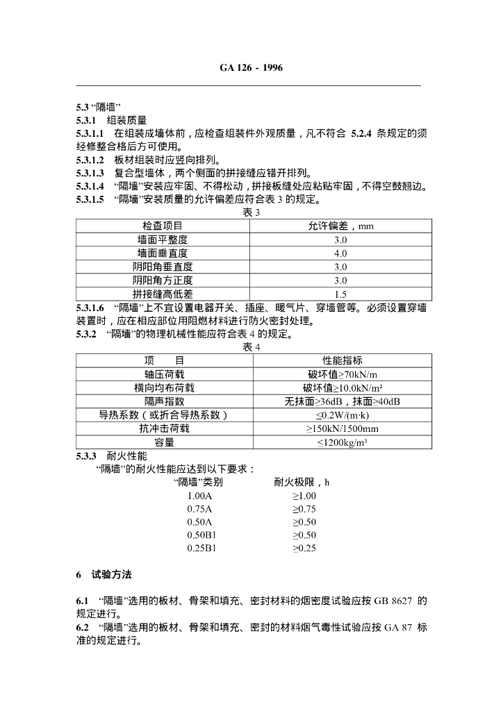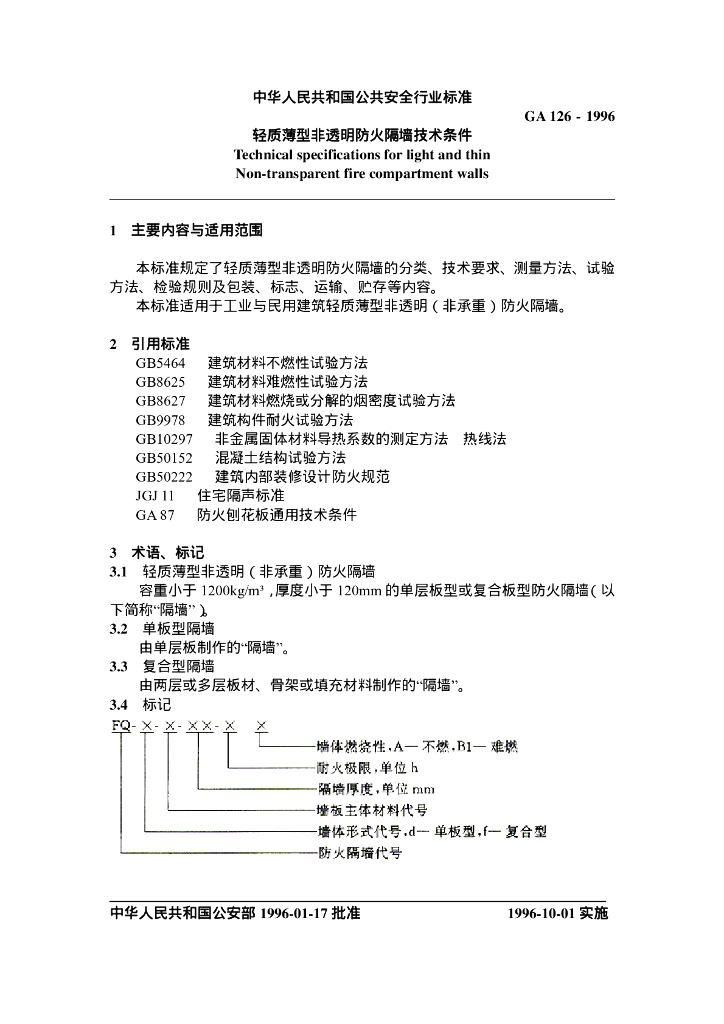 GA 126-1996 轻质薄型非透明防火隔墙技术条件