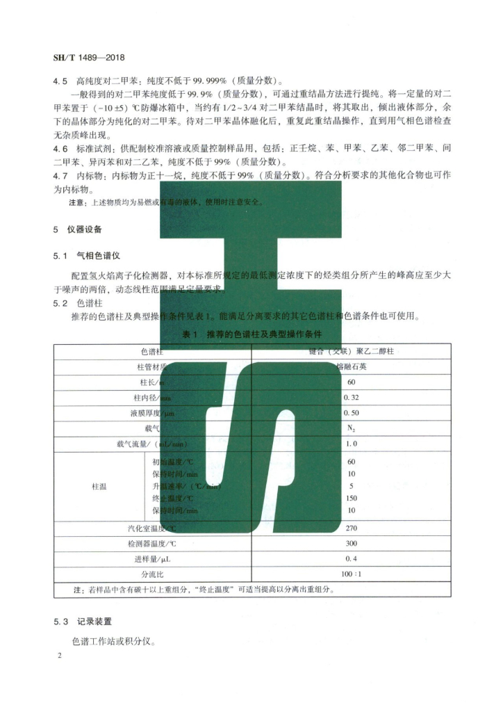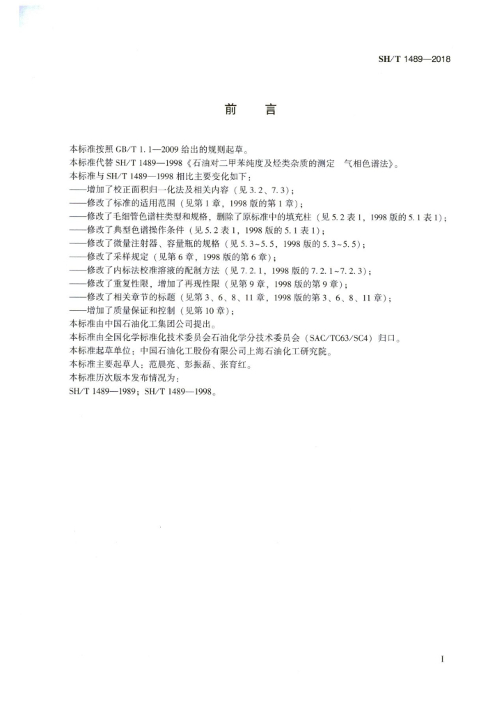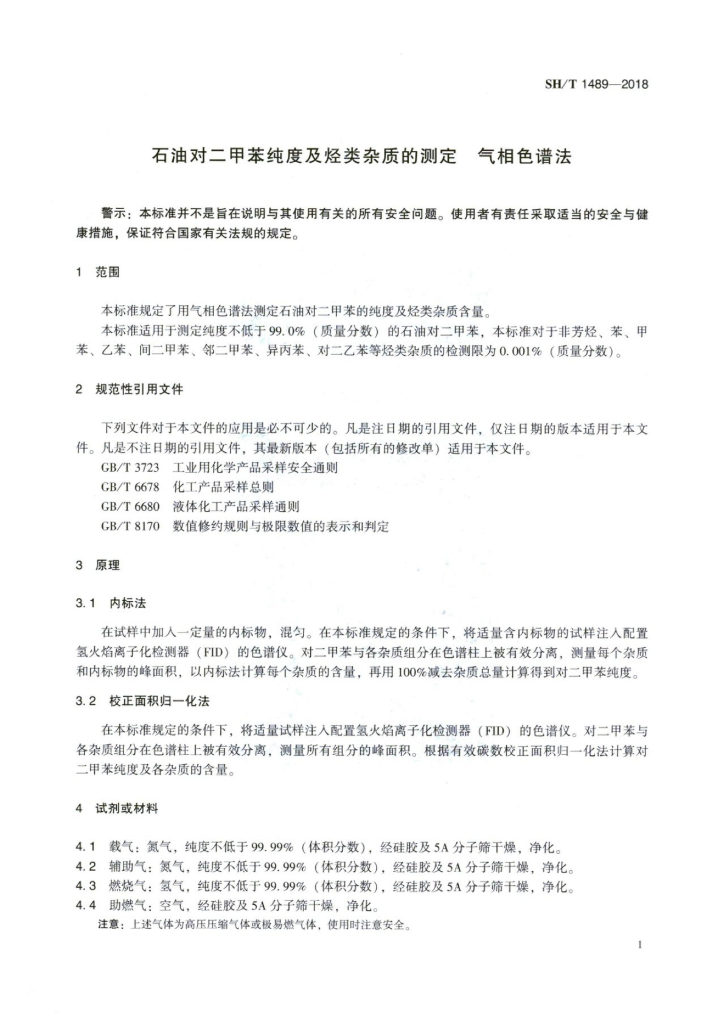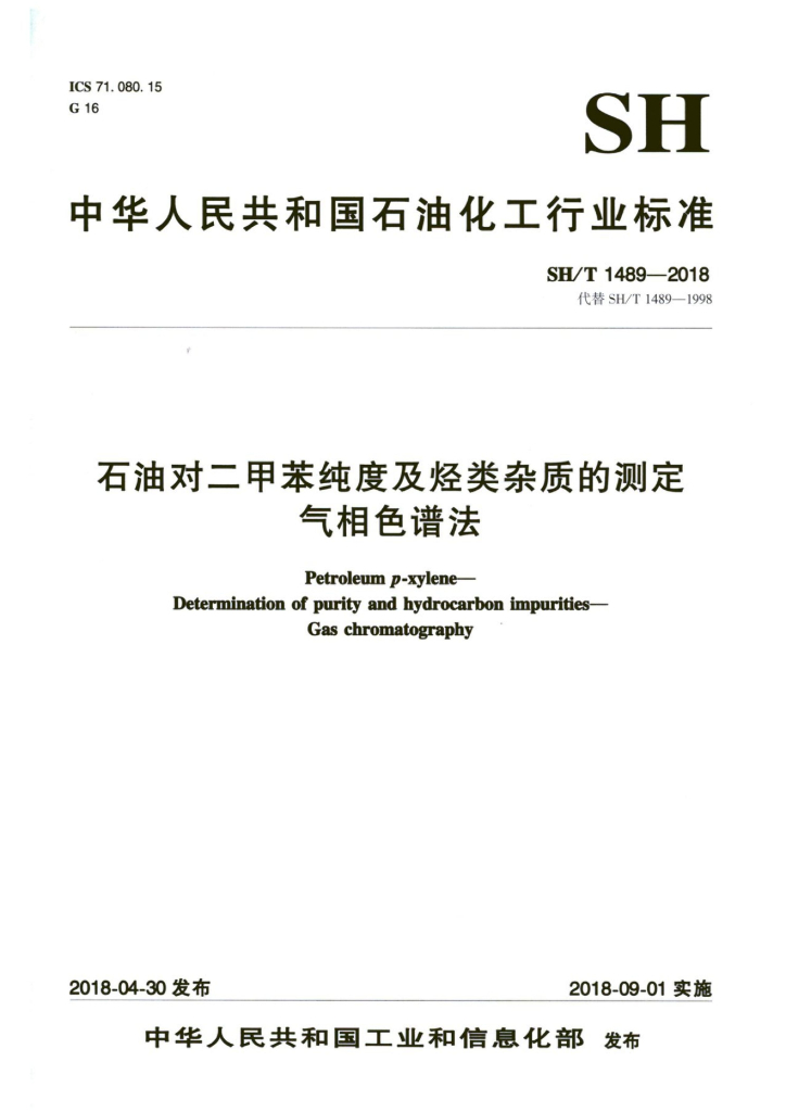 SH/T 1489-2018 石油对二甲苯纯度及烃类杂质的测定 气相色谱法