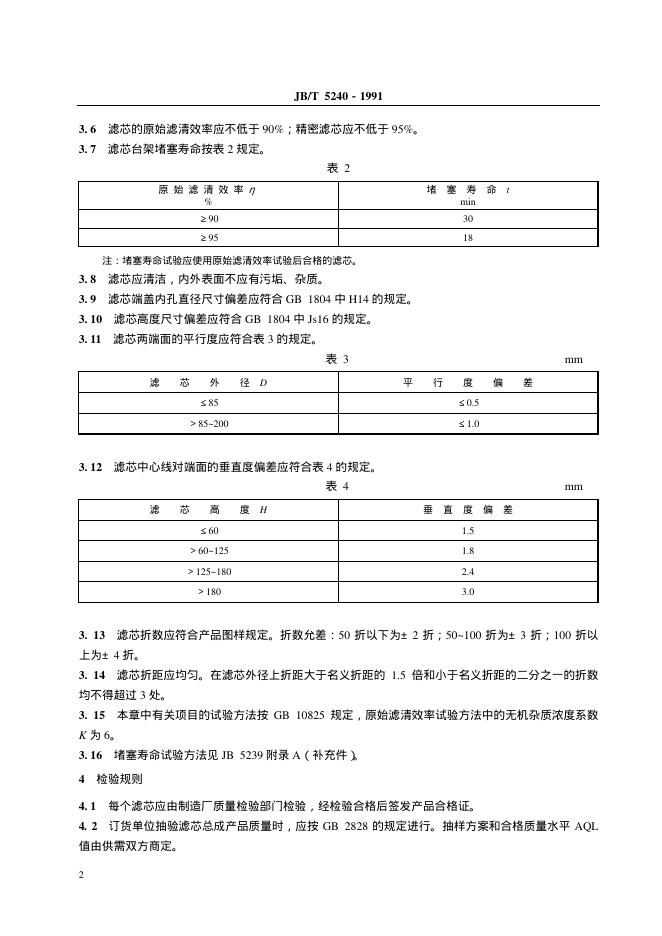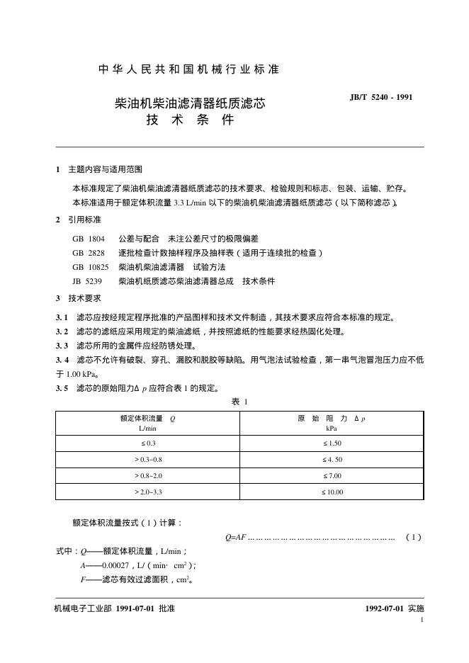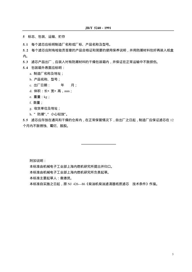 JB/T 5240-1991 柴油机柴油滤清器纸质滤芯技术条件