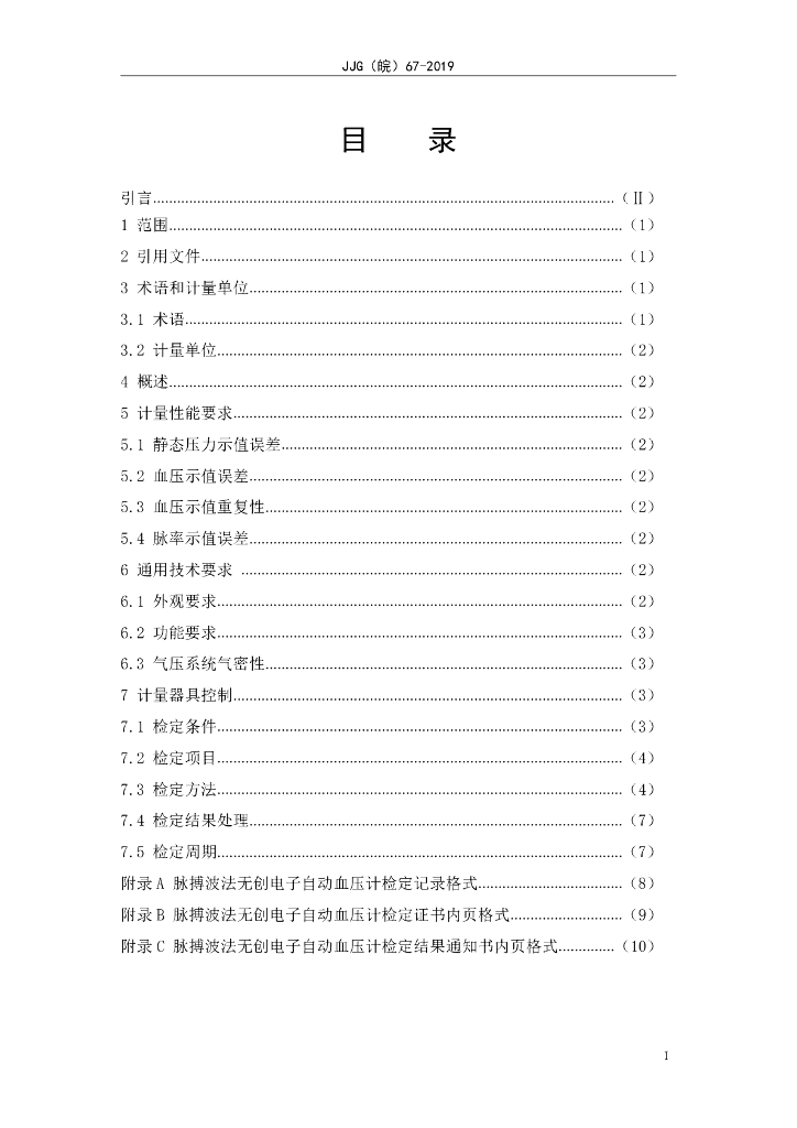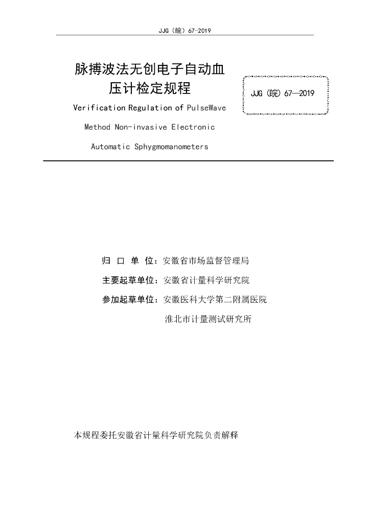 JJG(皖)67-2019 脉搏波法无创电子自动血压计检定规程