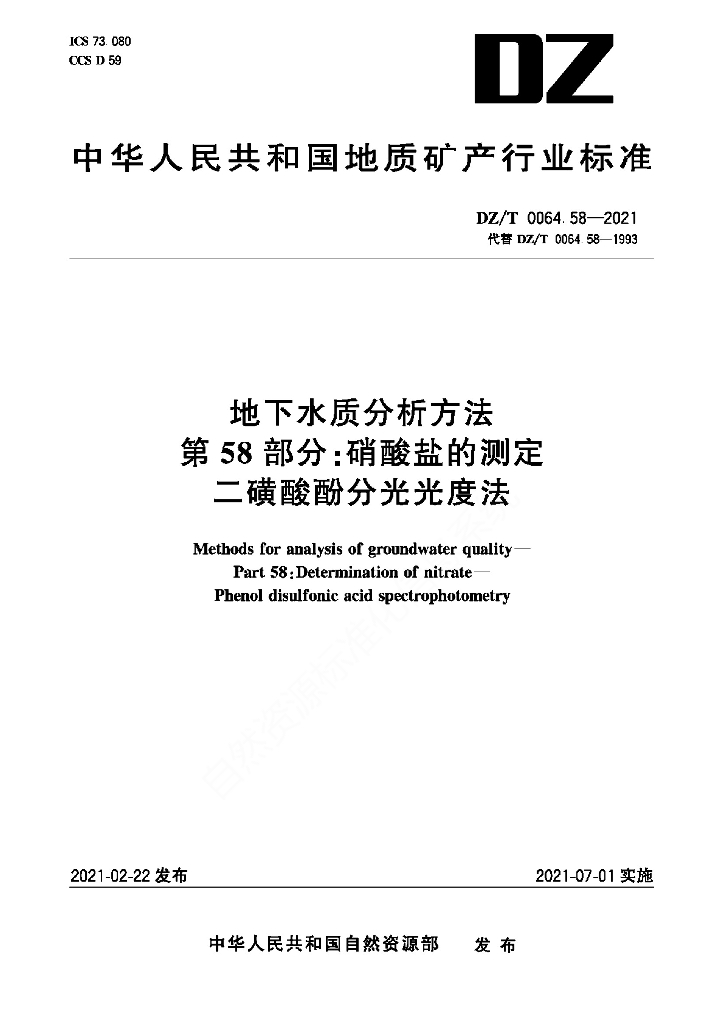 DZ/T 0064.580-2021 地下水质分析方法 第58部分:硝酸盐的测定二磺酸酚分光光度法