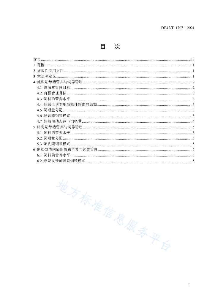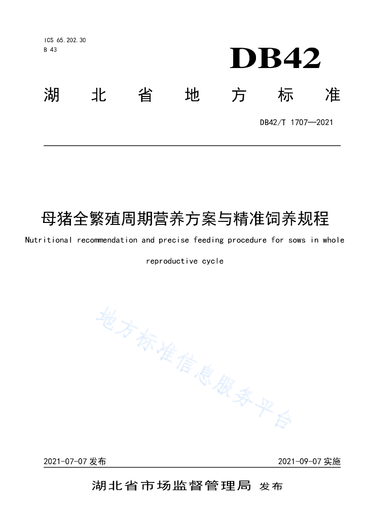 DB42/T 1707-2021 母猪全繁殖周期营养方案与精准饲养规程