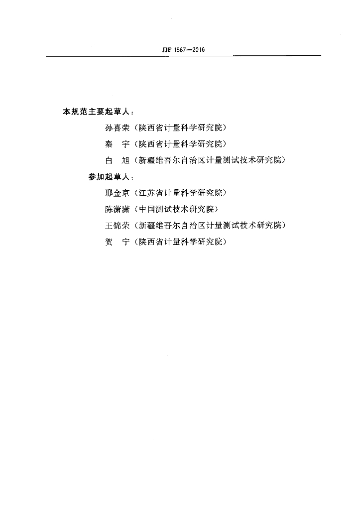 孙喜荣(陕西省计量科学研究院)、秦宇(陕西省计量科学研究院)、白旭(新疆维吾尔自治区计量测试技术研究院)、邢金京(江苏省计量科学研究院)、陈潇潇(中国测试技术研究院)、王锦荣(新疆维吾尔自治区计量测试技术研究院)、贺宁(陕西省计量科学研究院)
