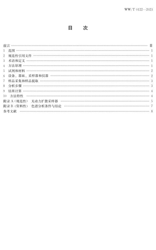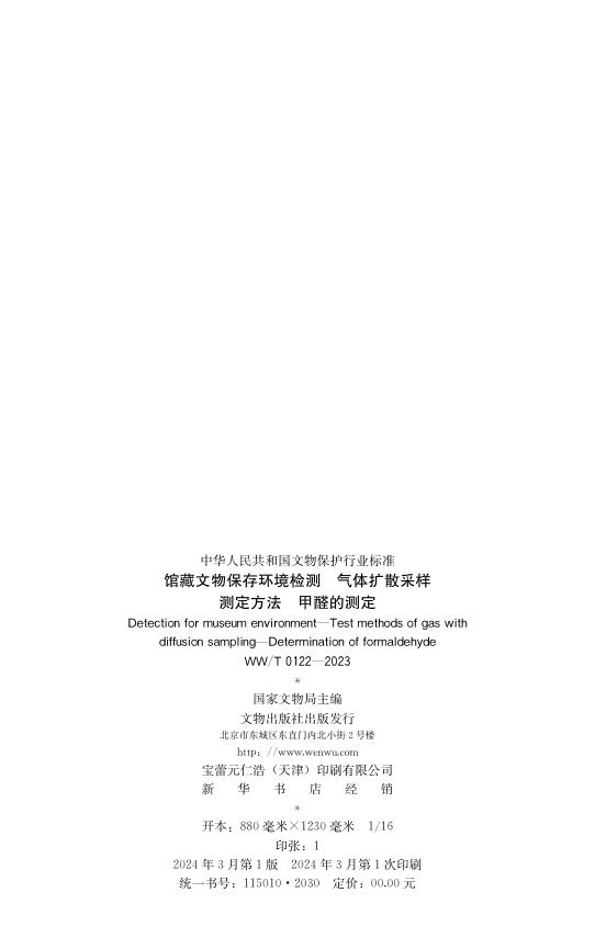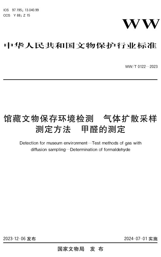 WW/T 0122-2023 馆藏文物保存环境检测 气体扩散采样测定方法 甲醛的测定