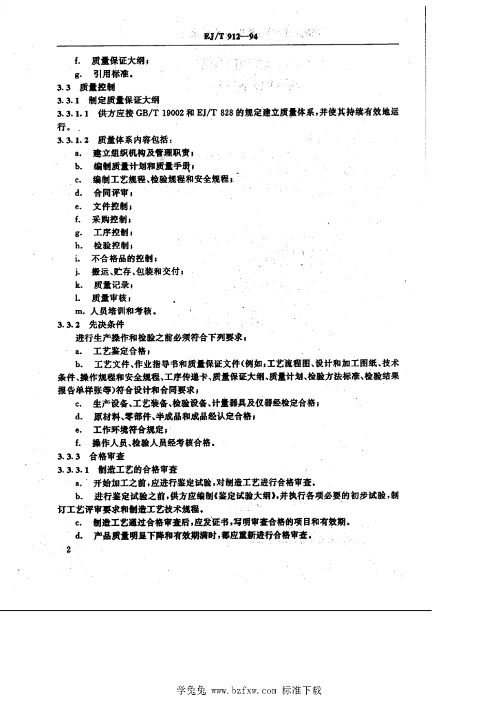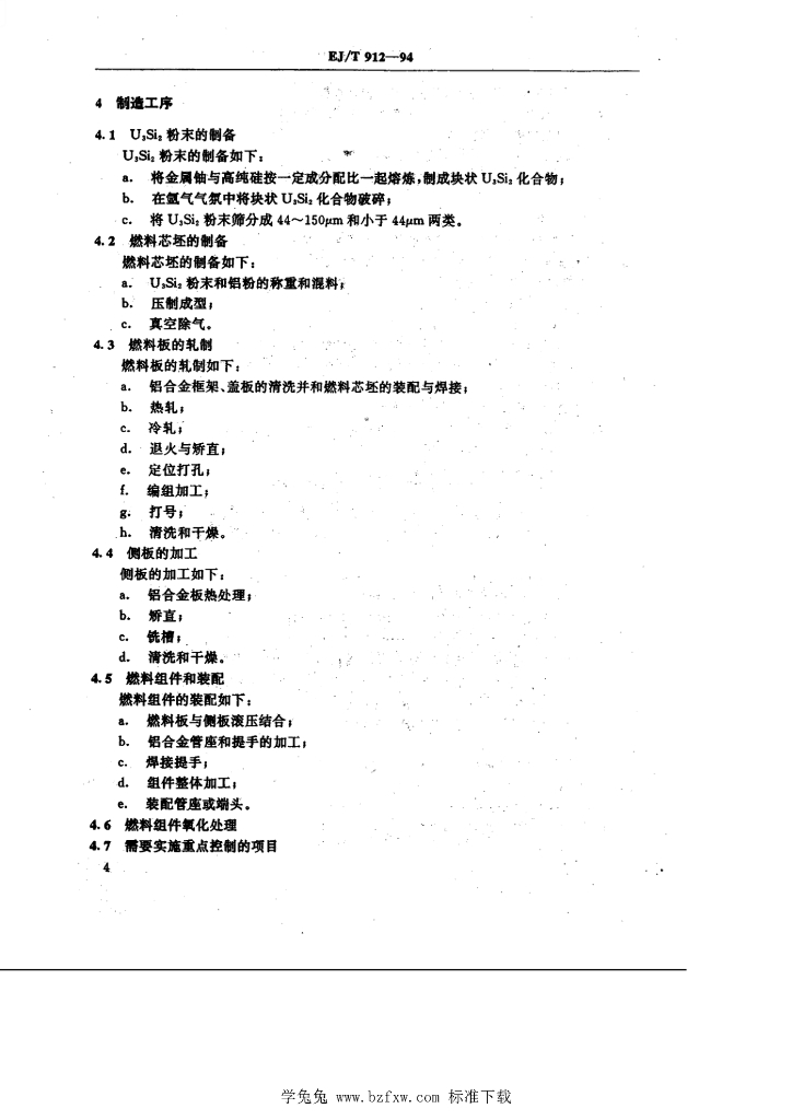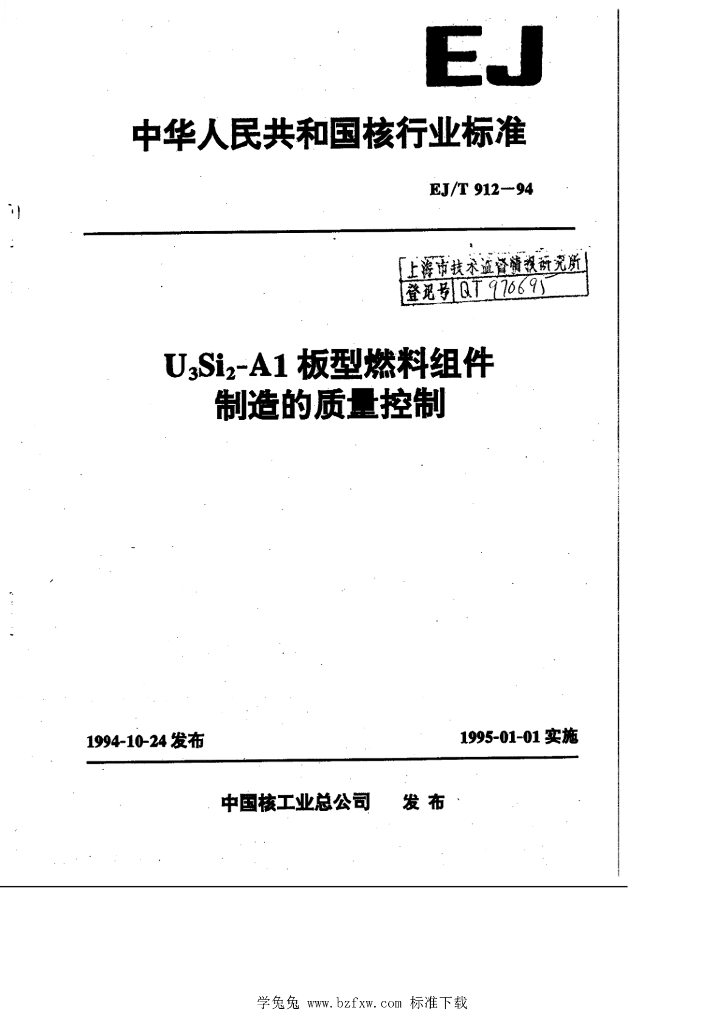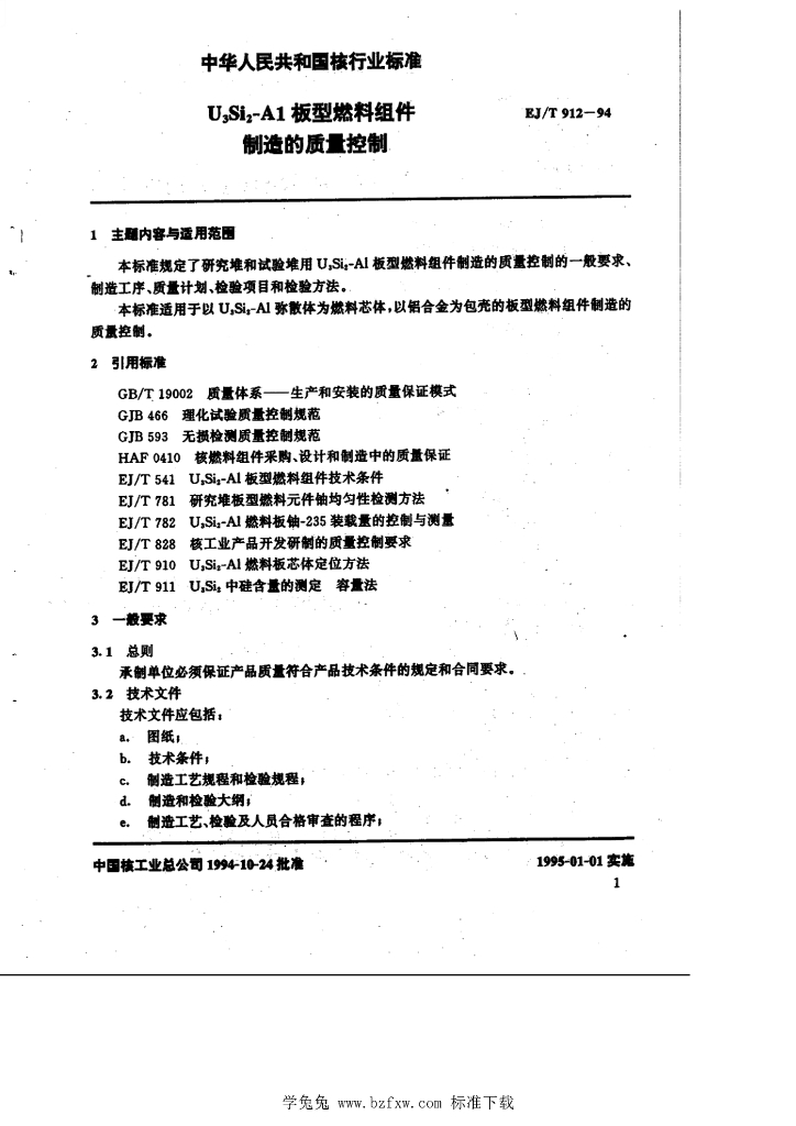 EJ/T 912-1994 铀三硅二-铝板型燃料组件 制造的质量控制