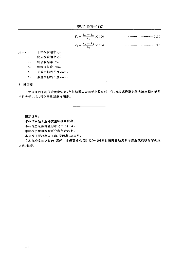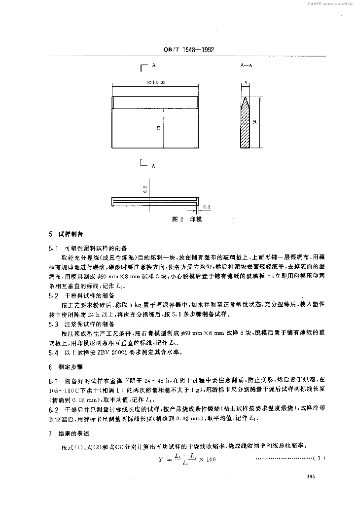 QB/T 1548一1992 陶瓷坯泥料线收缩率测定方法