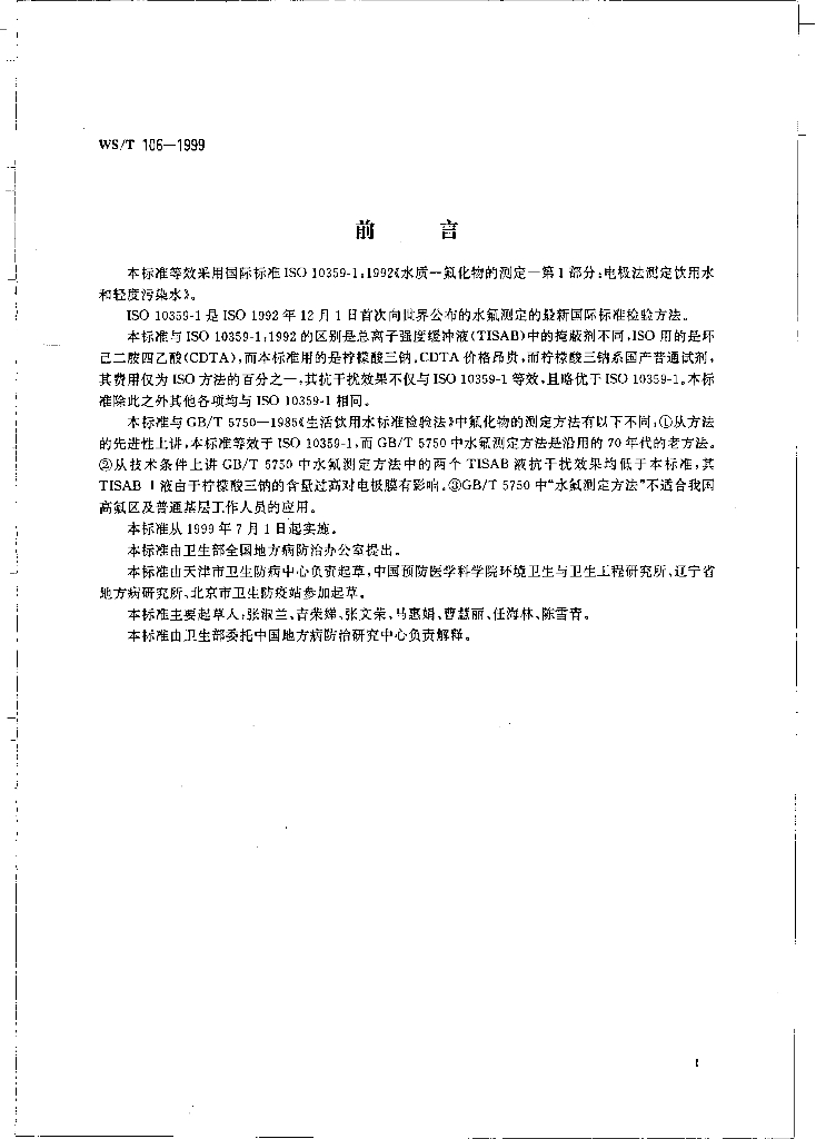 WS/T 106-1999 地方性氟中毒病区饮水氟化物的测定方法