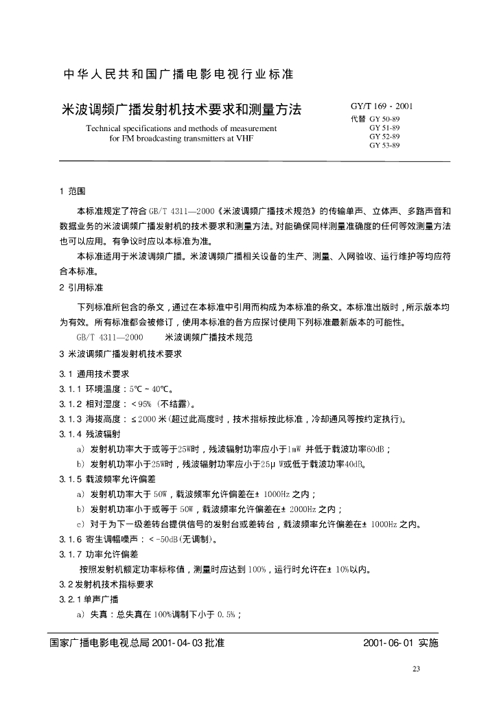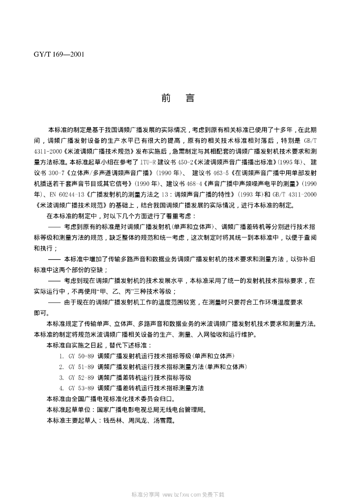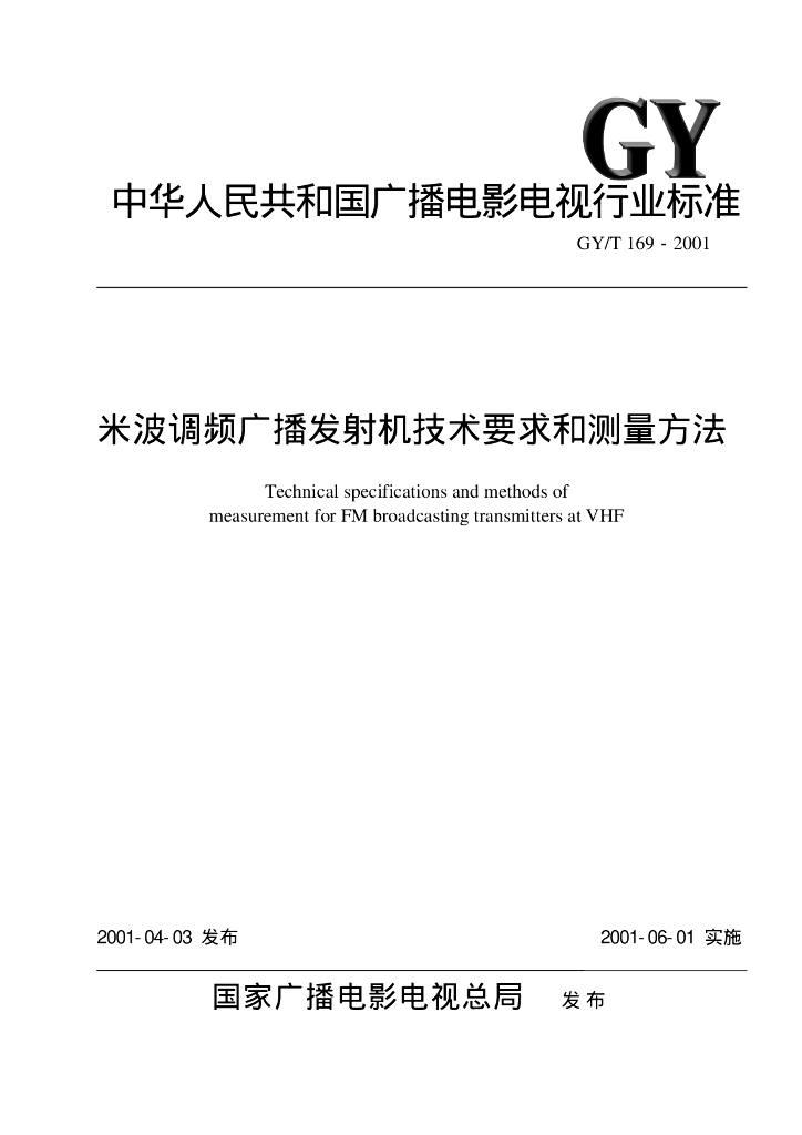 GY/T 169-2001 米波调频广播发射机技术要求和测量方法