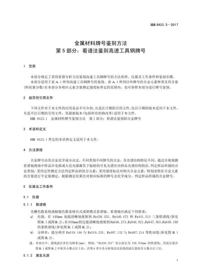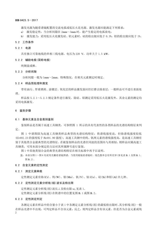 HB 8423.5-2017 金属材料牌号鉴别方法 第5部分:看谱法鉴别高速工具钢牌号