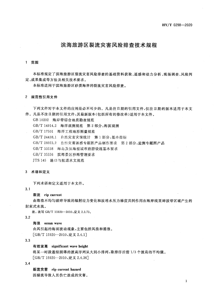 HY/T 0298-2020 滨海旅游区裂流灾害风险排查技术规程