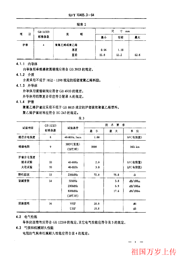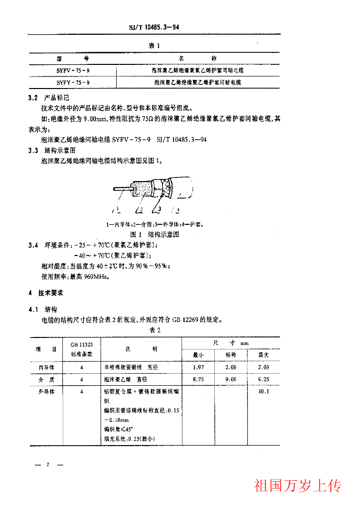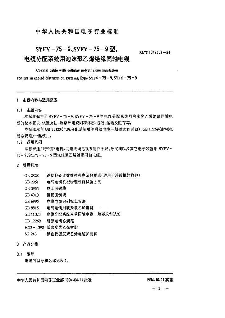 SJ/T 10485.3-1994 SYFV-75-9、SYFY-75-9 型电缆分配系统用泡沫聚乙烯绝缘同轴电缆