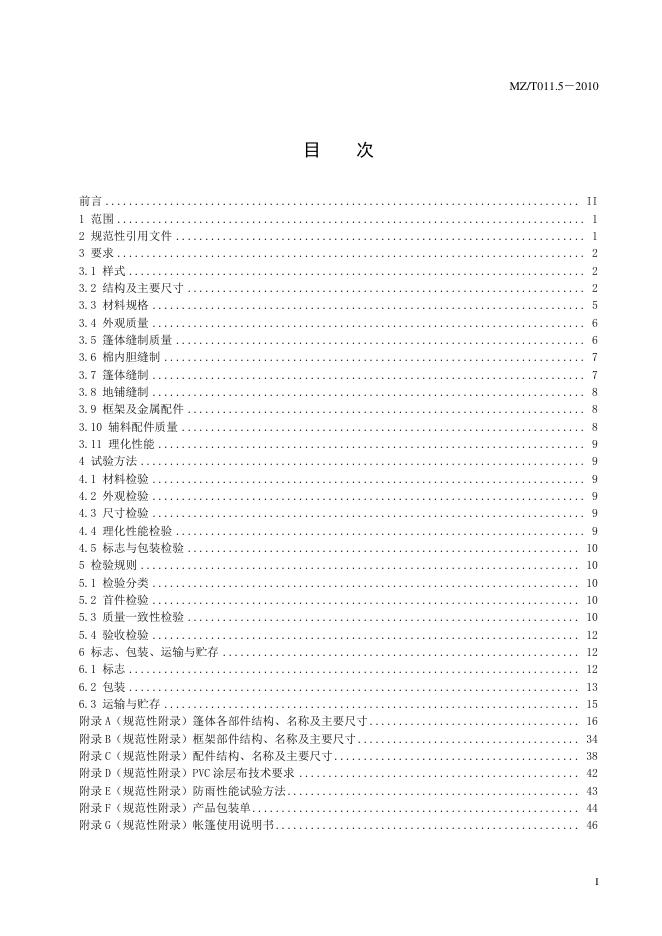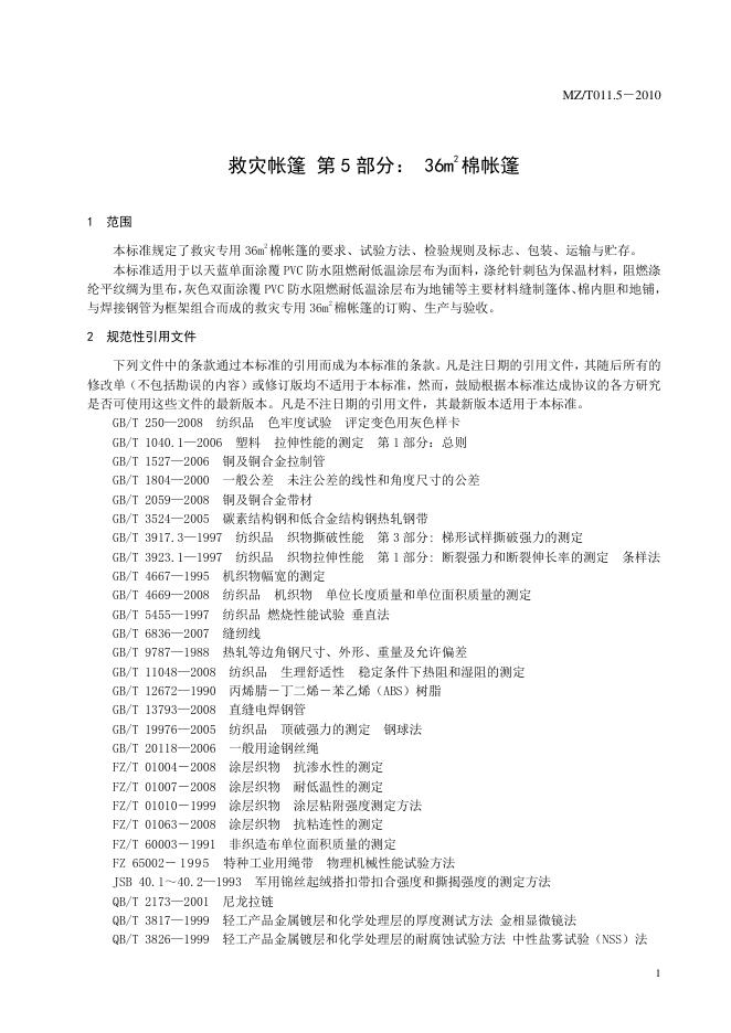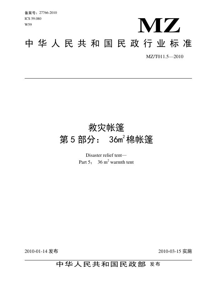 MZ/T 011.5-2010 救灾帐篷 第5部分:36㎡棉帐篷