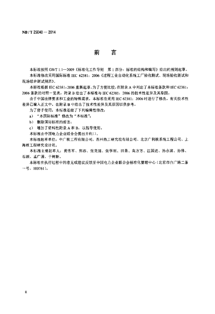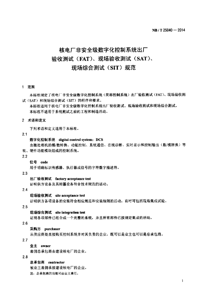 NB/T 25040-2014 核电厂非安全级数字化控制系统出厂 验收测试(FAT)、现场验收测试(SAT)、现场综合测试(SIT)规范
