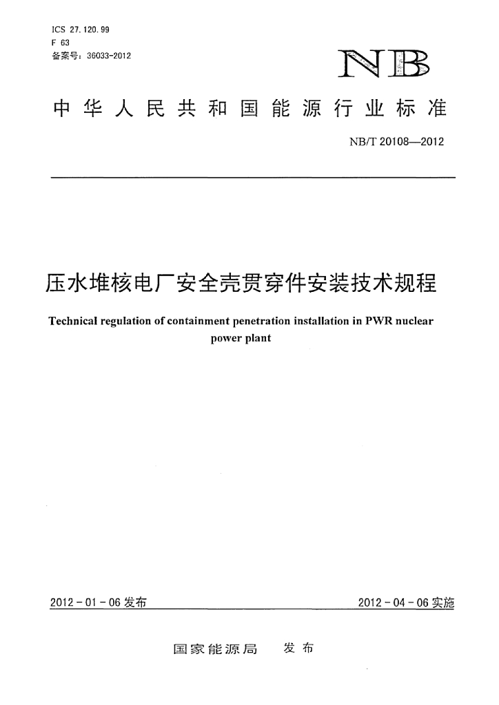 NB/T 20108-2012 压水堆核电厂安全壳贯穿件安装技术规程