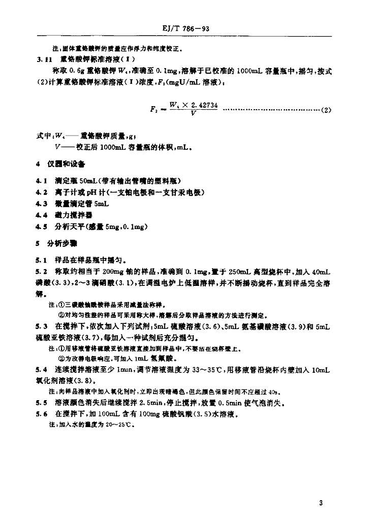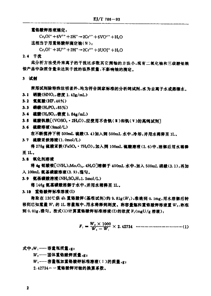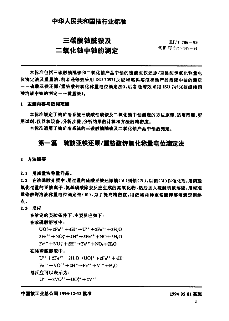 EJ/T 786-1993 三碳酸铀酰铵及二氧化铀中铀的测定