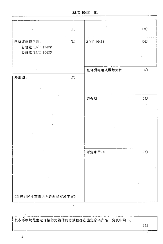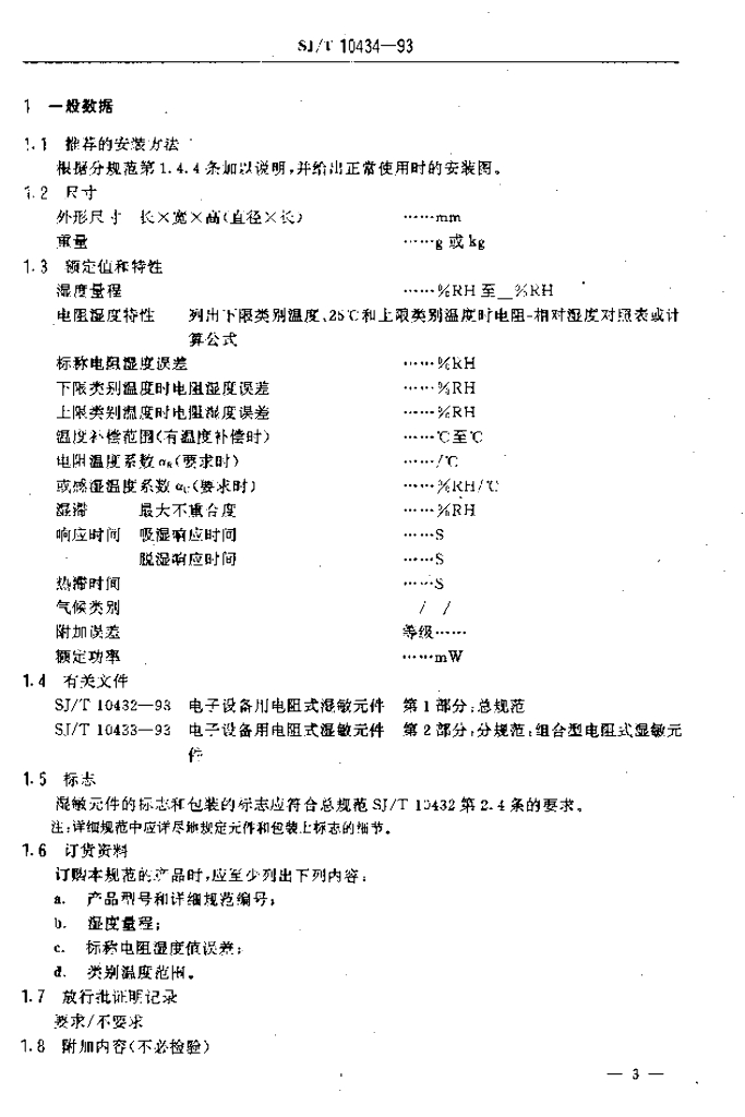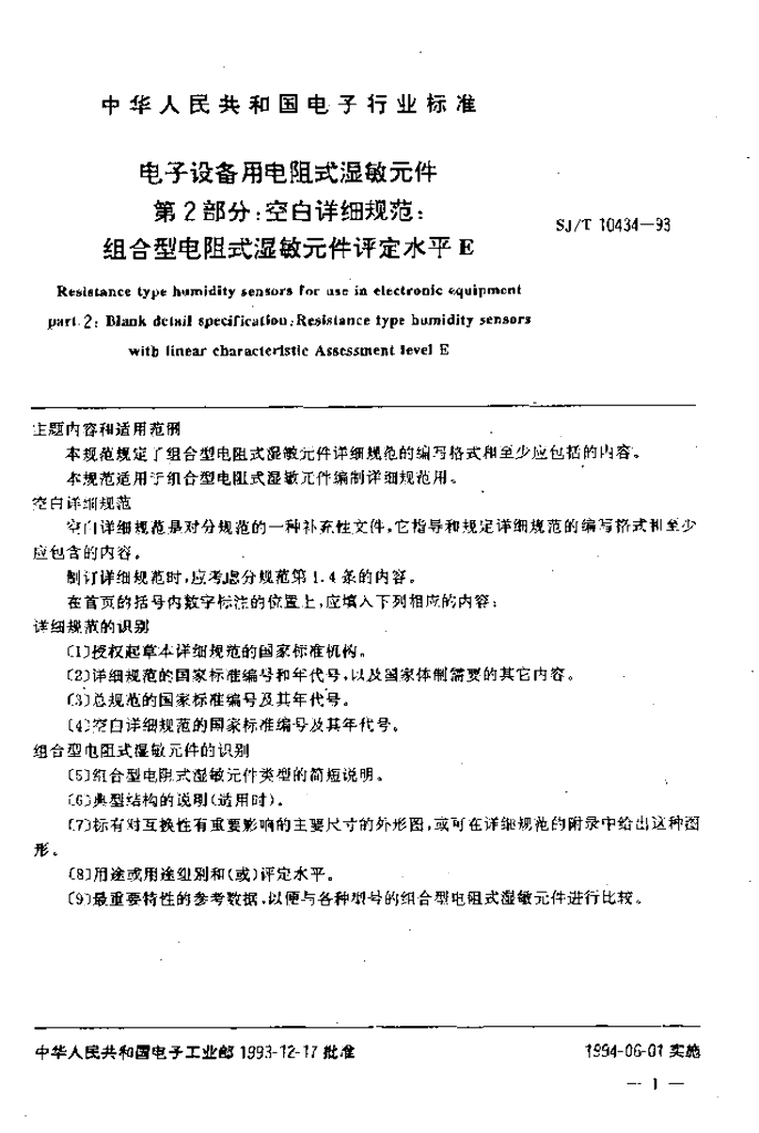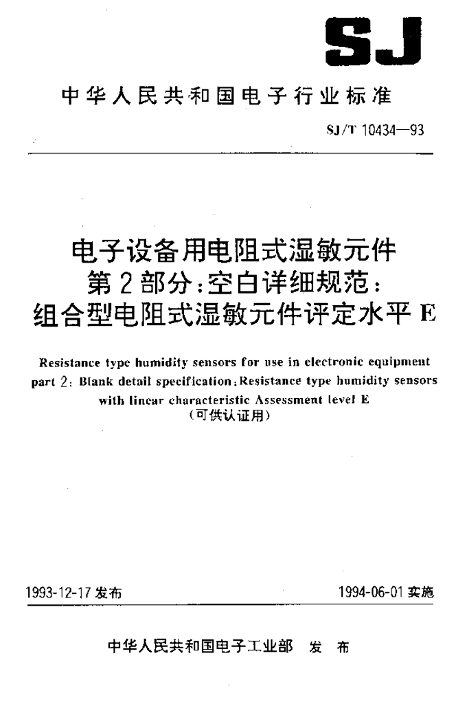 SJ/T 10434-1993 电子设备用电阻式湿敏元件 第2部分:空白详细规范:组合型电阻式湿敏元件评定水平E