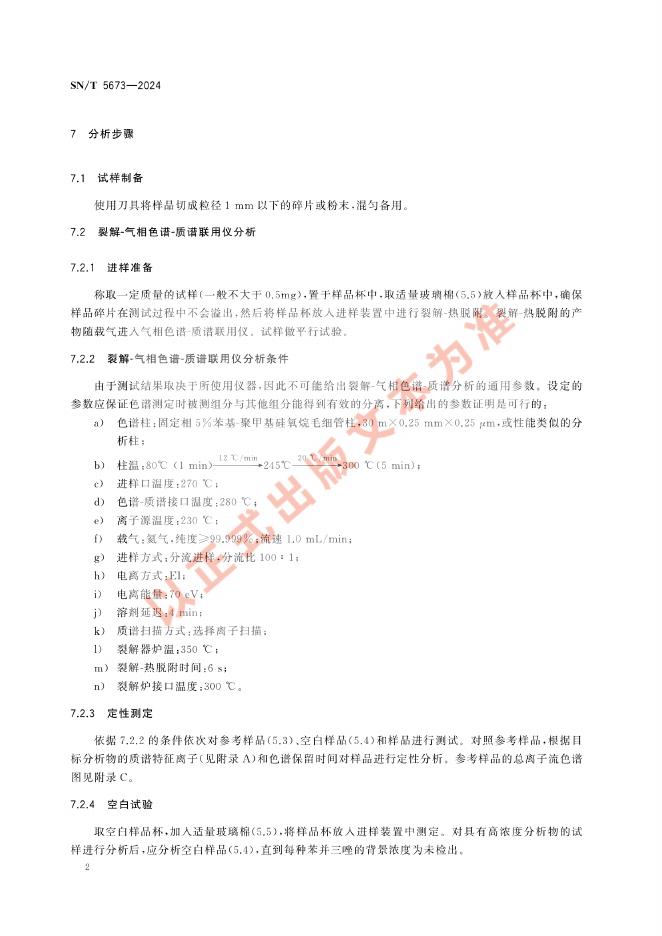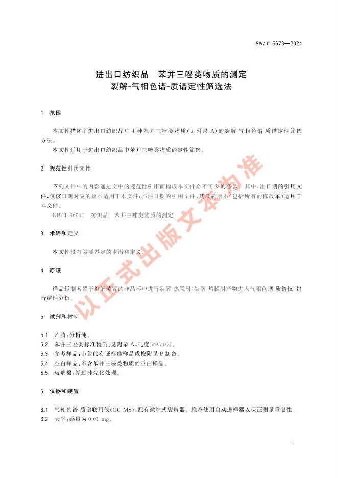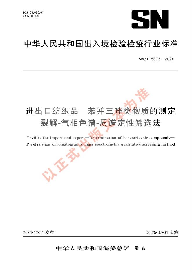 SN/T 5673-2024 进出口纺织品 苯并三唑类物质的测定 裂解-气相色谱-质谱定性筛选法