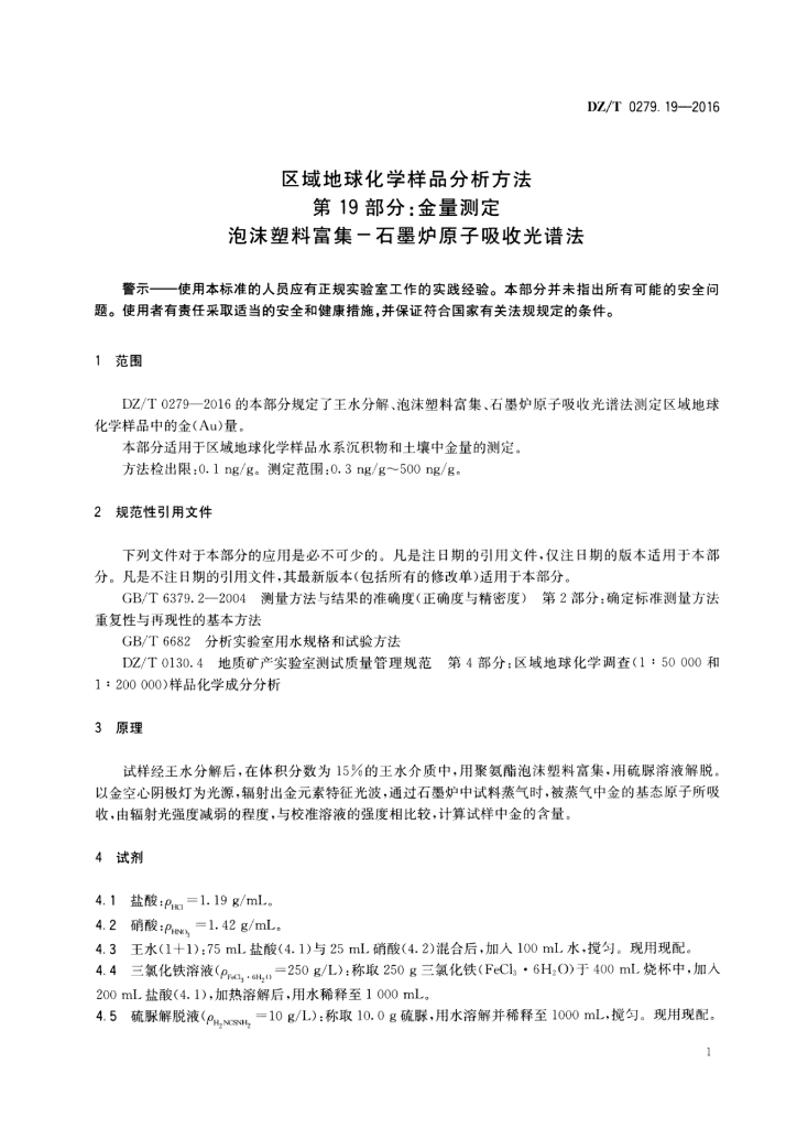 DZ/T 0279.19-2016 区域地球化学样品分析方法 第19部分:金量测定泡沫塑料富集-石墨炉原子吸收光谱法