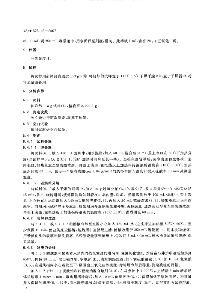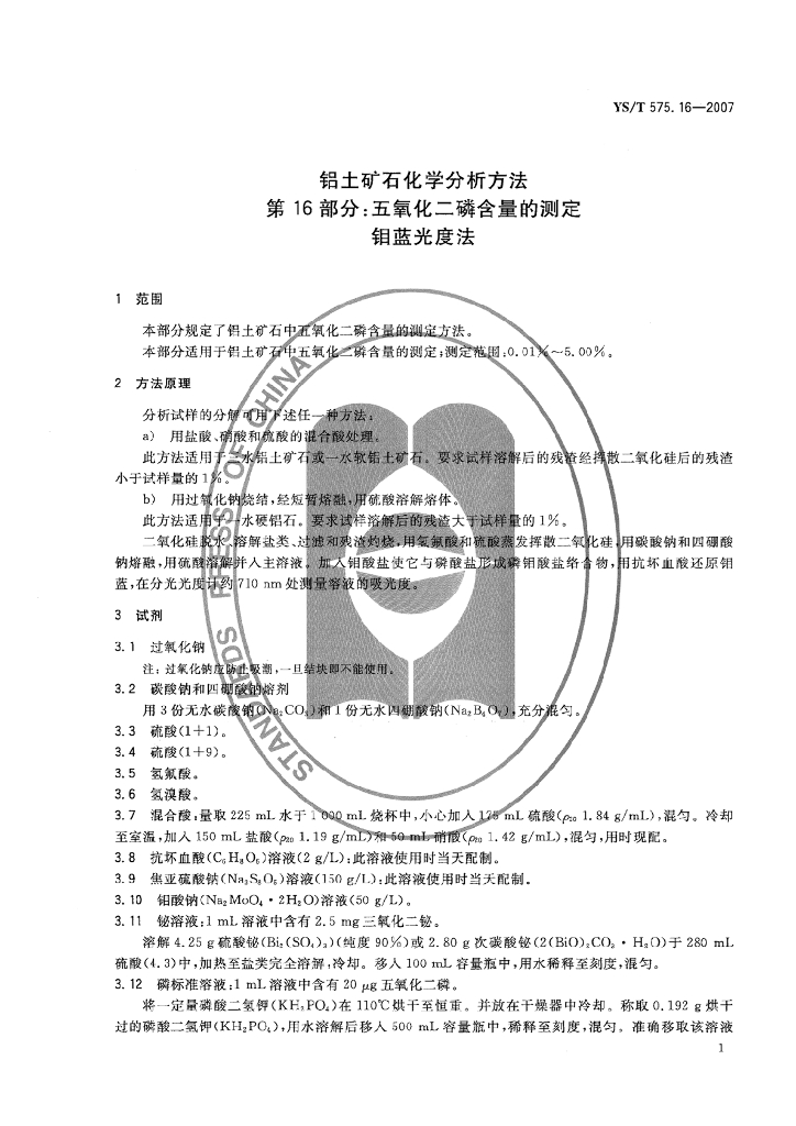 YS/T 575.16-2007 铝土矿石化学分析方法 第16部分:五氧化二磷含量的测定 钼蓝光度法