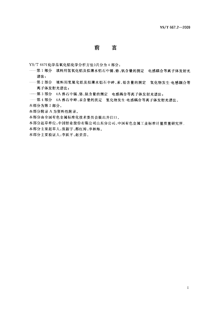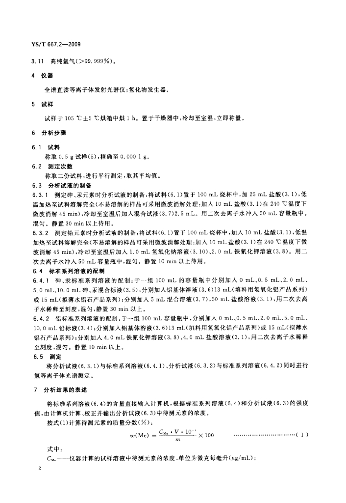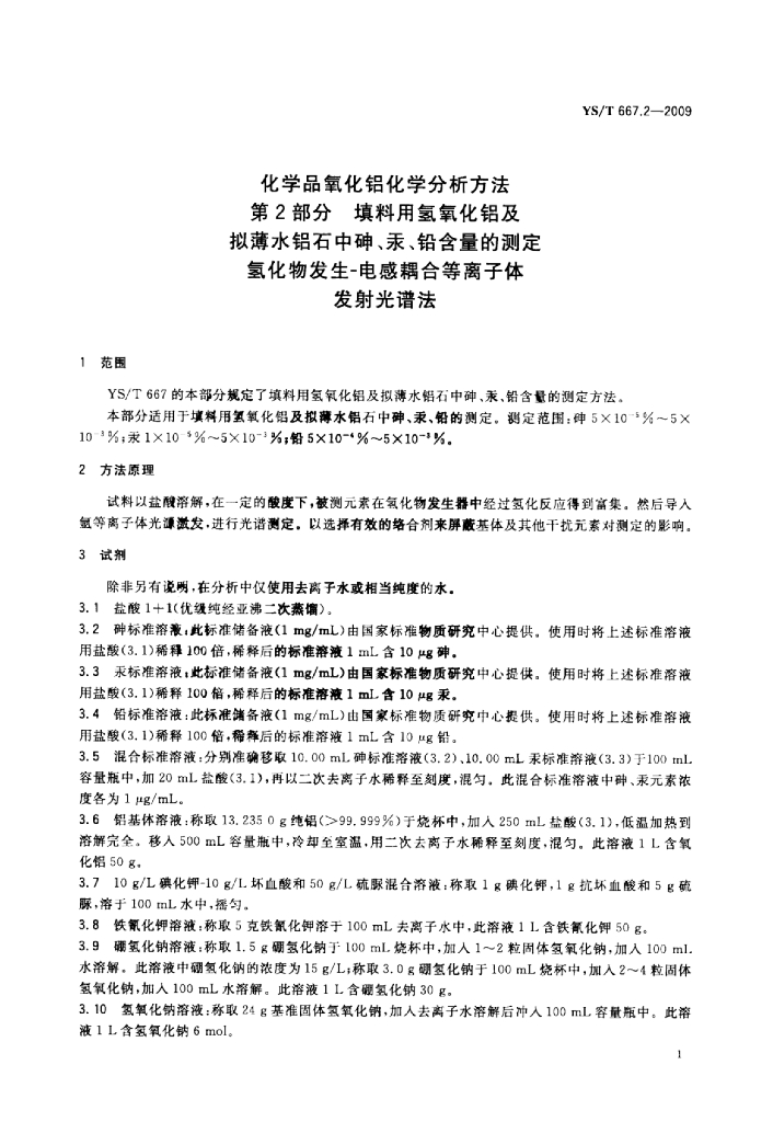 YS/T 667.2-2009 化学品氧化铝化学分析方法 第2部分:填料用氢氧化铝及拟薄水铝石中砷汞、铅含量的测定氢化物发生-电感耦合等离子体发射光谱法