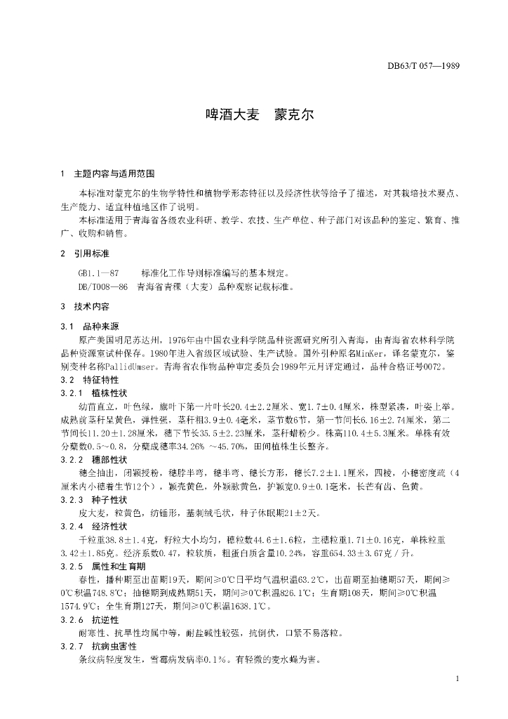 DB63/T 057-1989 啤酒大麦 蒙克尔
