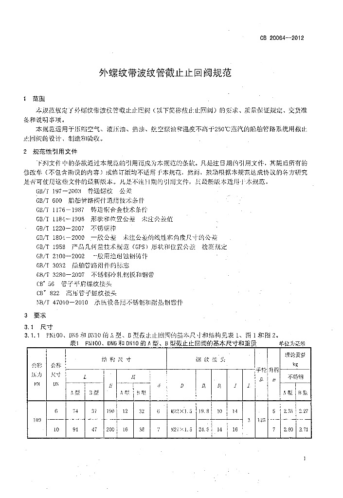 CB 20064-2012 外螺纹带波纹管截止止回阀规范