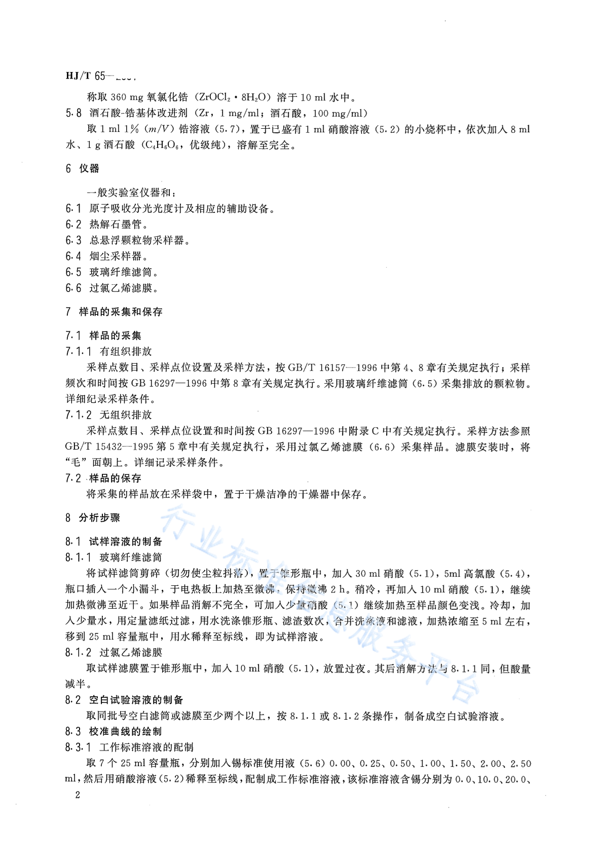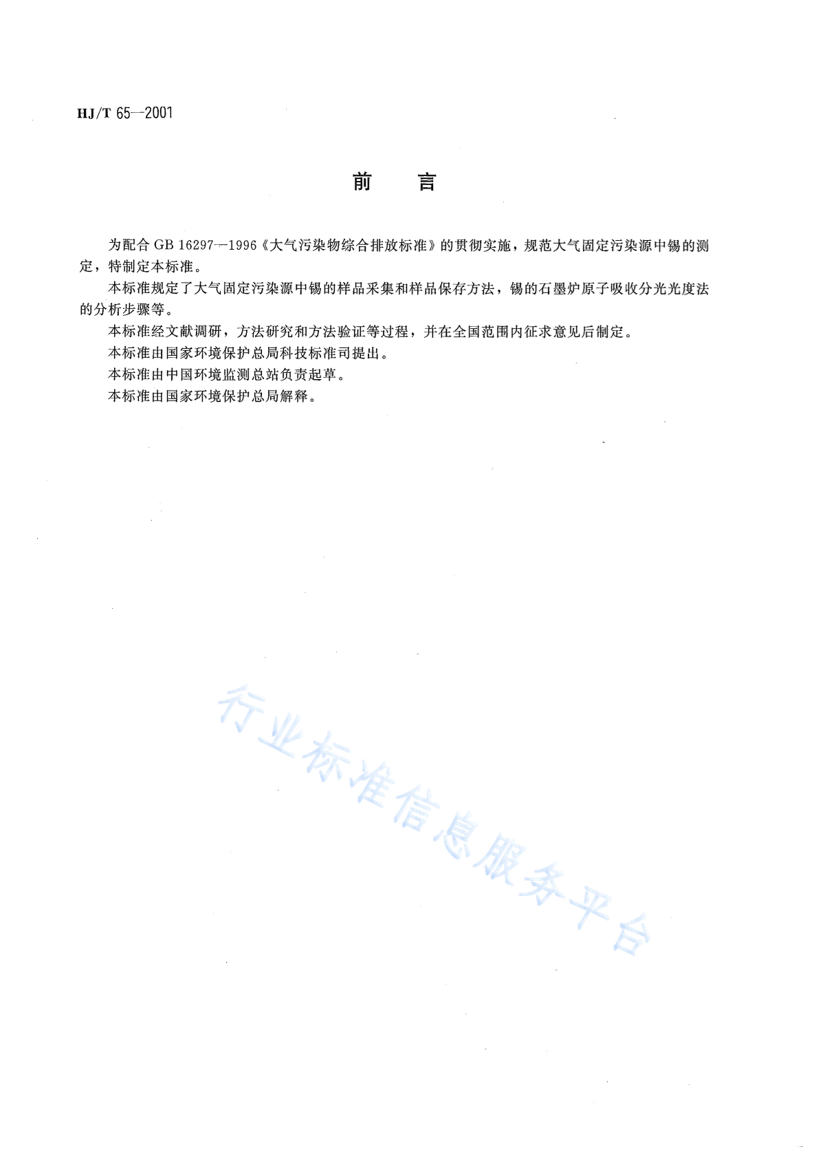 HJ/T 65-2001 大气固定污染源 锡的测定 石墨炉原子吸收分光光度法