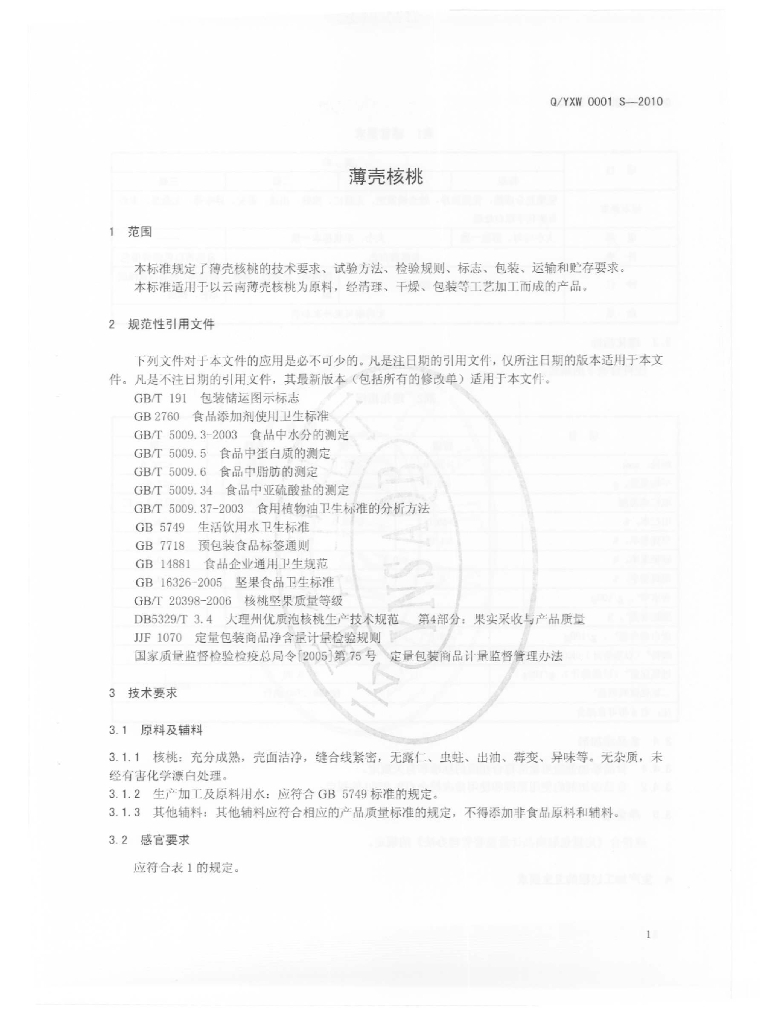 Q/YXW 0001S-2010 薄壳核桃
