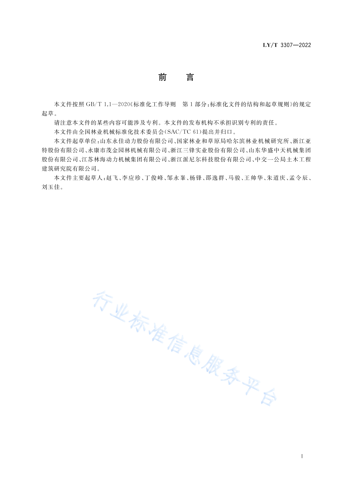 山东永佳动力股份有限公司、国家林业和草原局哈尔滨林业机械研究所、浙江亚特股份有限公司、永康市茂金园林机械有限公司、浙江三锋实业股份有限公司、山东华盛中天机械集团股份有限公司、江苏林海动力机械集团有限公司、浙江派尼尔科技股份有限公司、中交一公局土木工程建筑研究院有限公司