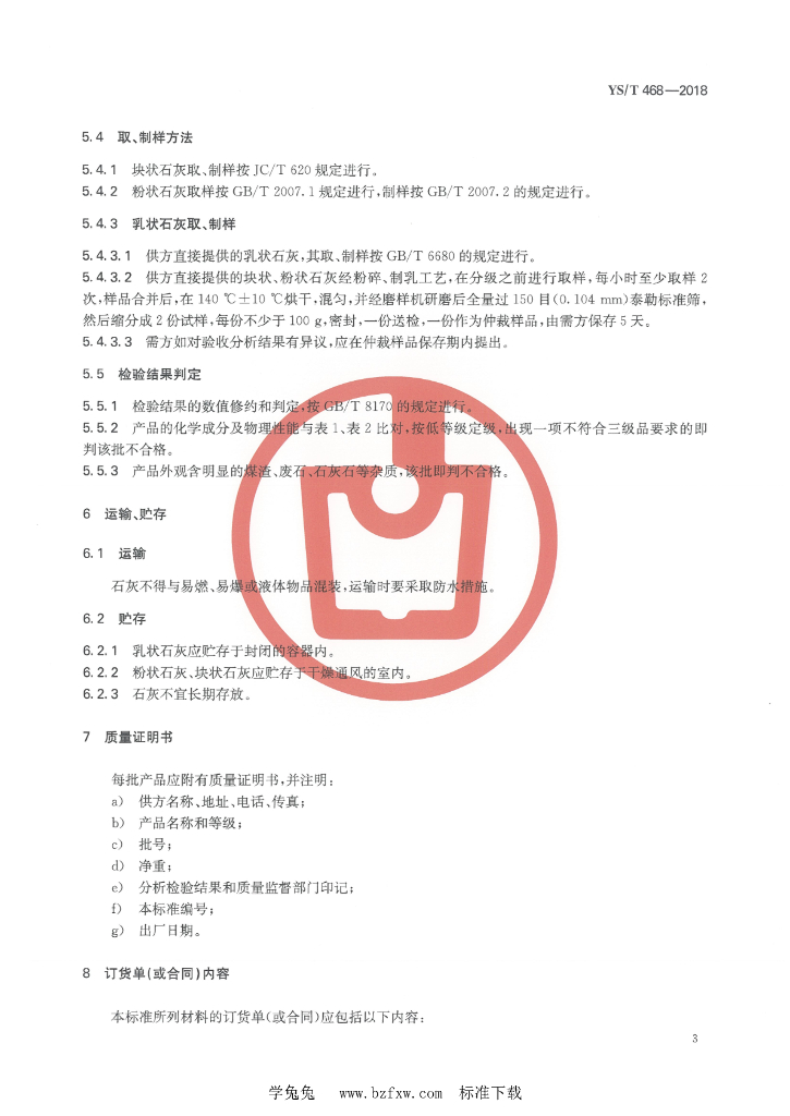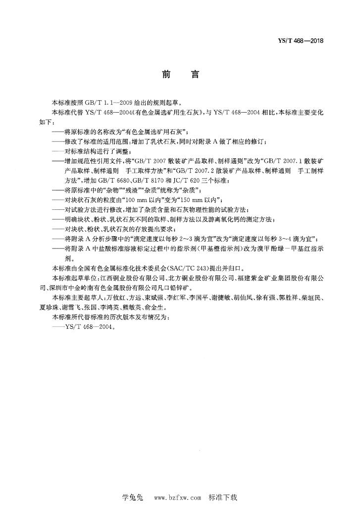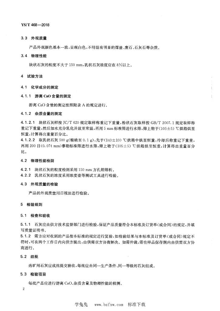 YS/T 468-2018 有色金属选矿用石灰