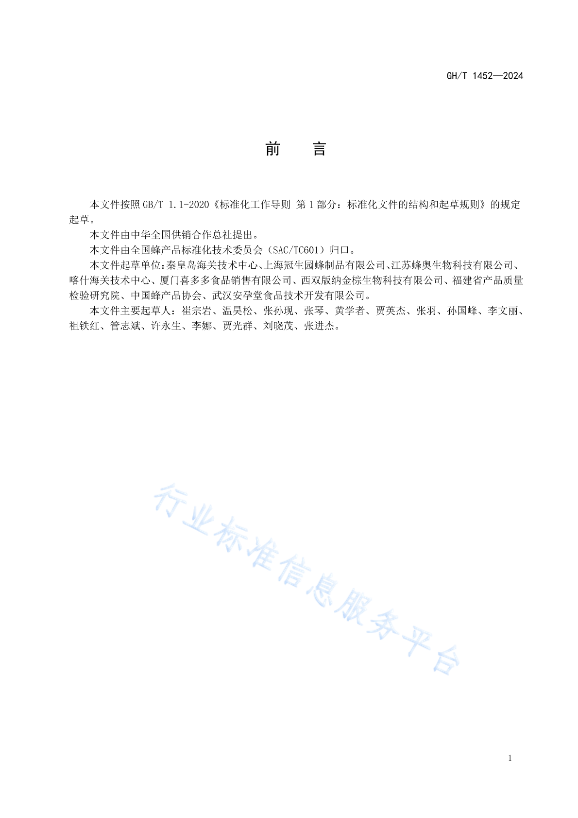 秦皇岛海关技术中心、上海冠生园蜂制品有限公司、江苏蜂奥生物科技有限公司、喀什海关技术中心、厦门喜多多食品销售有限公司、西双版纳金棕生物科技有限公司、福建省产品质量检验研究院、中国蜂产品协会、武汉安孕堂食品技术开发有限公司