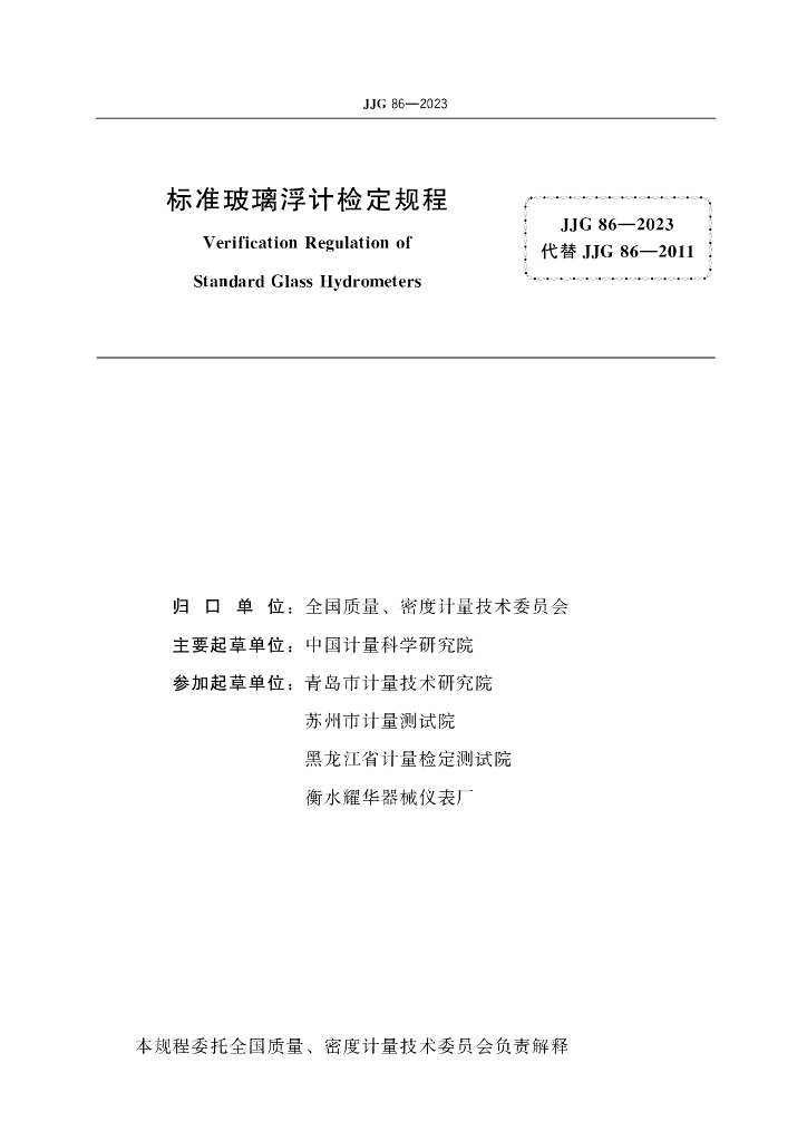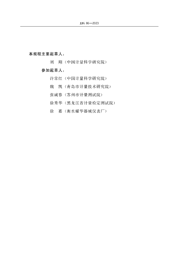 刘翔(中国计量科学研究院)、许常红(中国计量科学研究院)、魏凯(青岛市计量技术研究院)、张诚春(苏州市计量测试院)、徐秀华(黑龙江省计量检定测试院)、徐嘉(衡水耀华器械仪表厂)