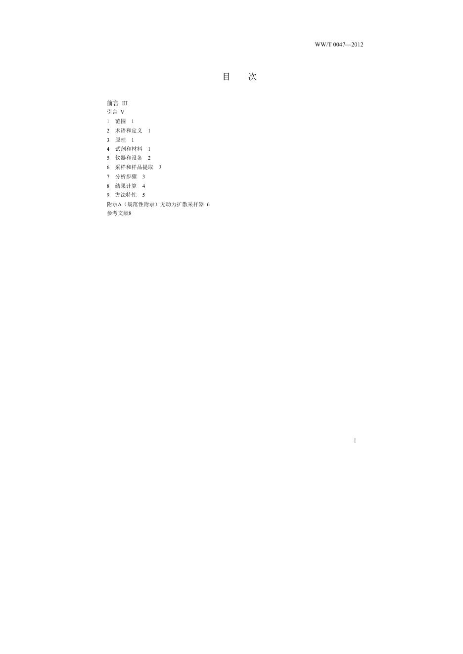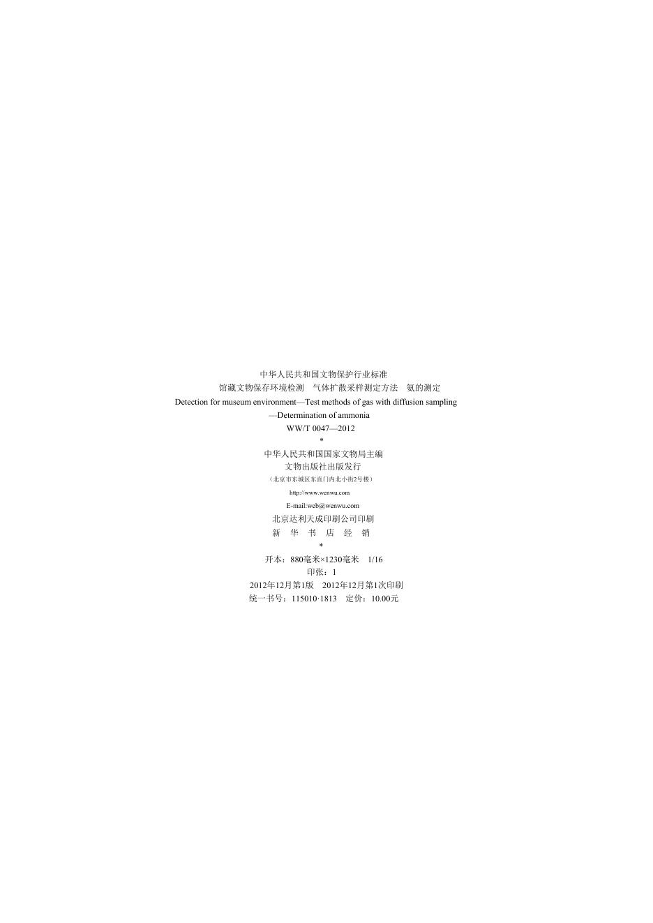 WW/T 0047-2012 馆藏文物保存环境检测 气体扩散采样测定方法 氨的测定
