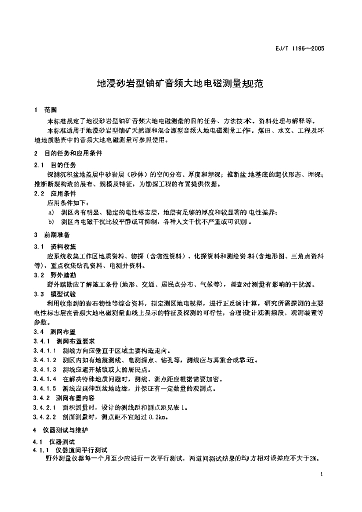 EJ/T 1196-2005 地浸砂岩型铀矿音频大地电磁测量规范