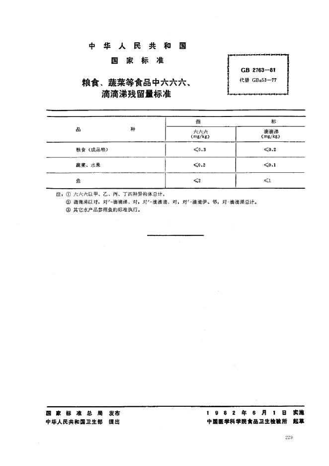 GB 2763-1981 粮食、蔬菜等食品中六六六、滴滴涕残留量标准