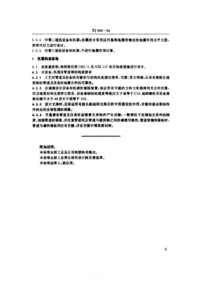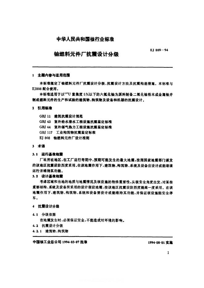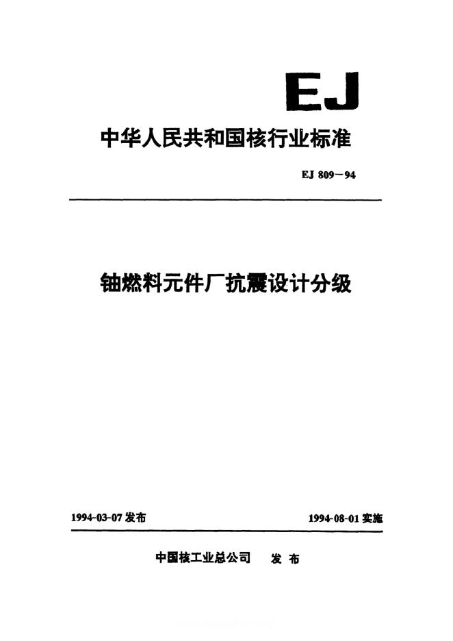 EJ/T 809-1994 铀燃料元件厂抗震设计分级