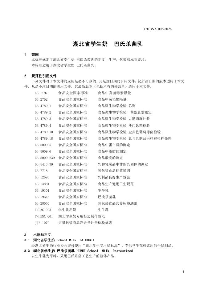 T/HBNX 003-2026 湖北省学生奶 巴氏杀菌乳