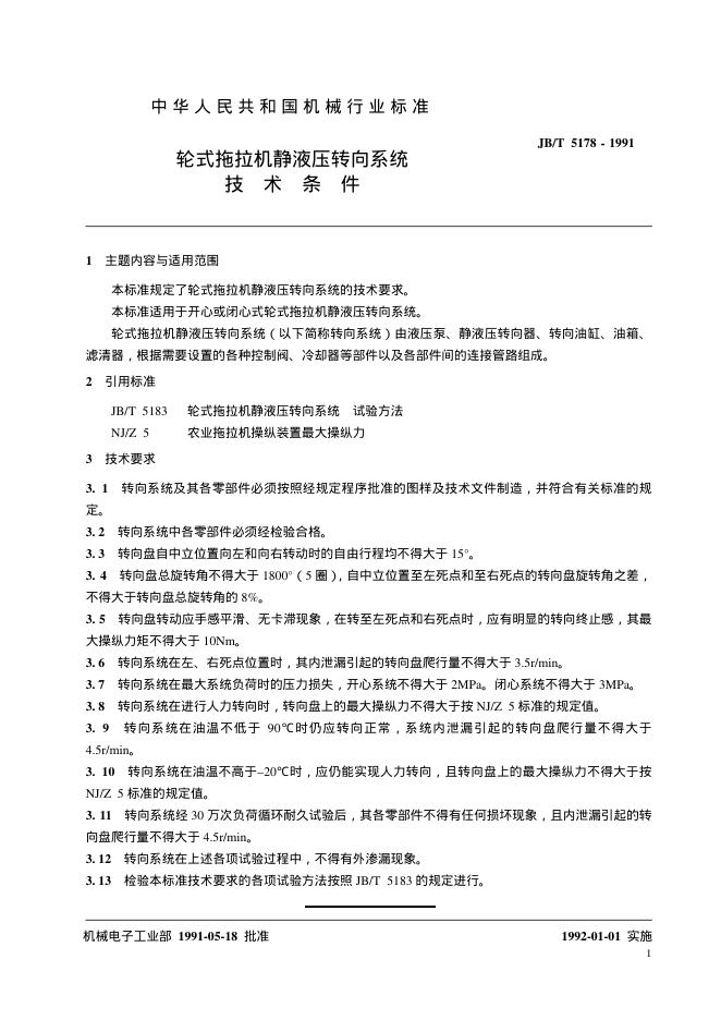 JB 5178-1991 轮式拖拉机静压转向系统技术条件