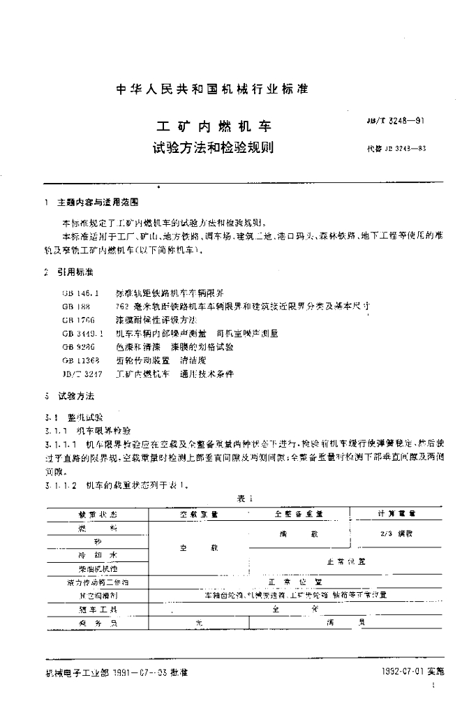 JB/T 3248-1991 工矿内燃机车 试验方法检验规则