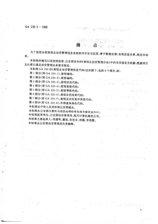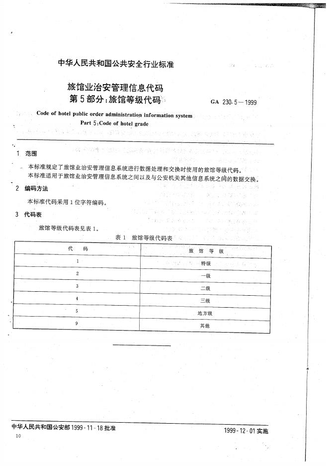 GA 230.5-1999 旅馆业治安管理信息代码 第五部分 旅馆等级代码