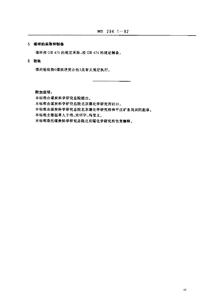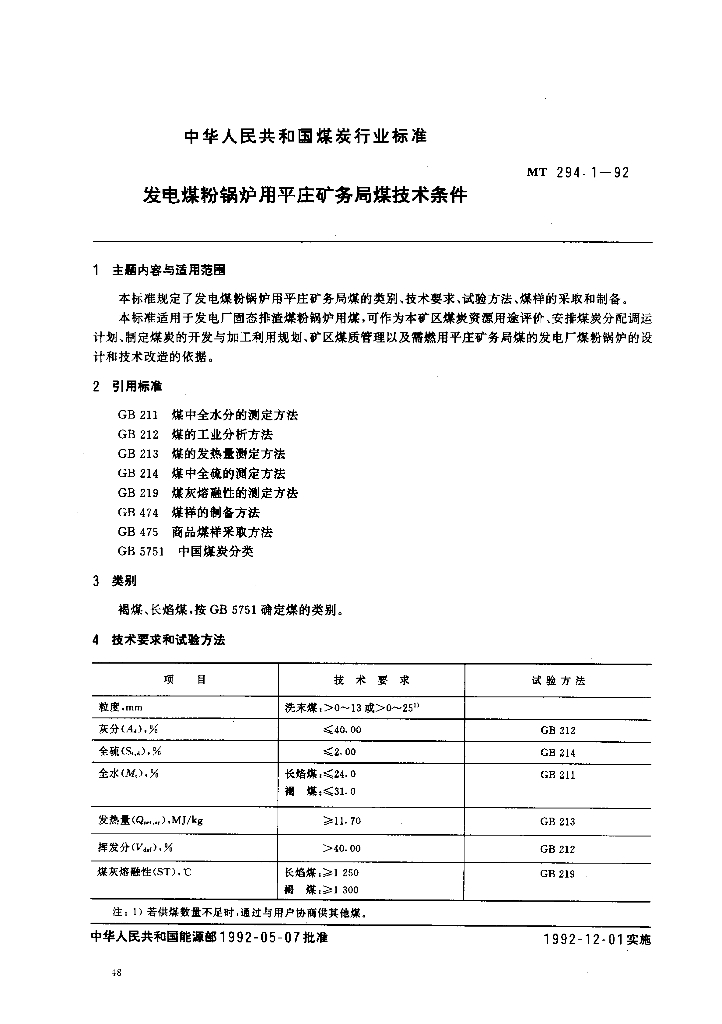 MT 294.1-1992 发电煤粉锅炉用平庄矿务局煤技术条件