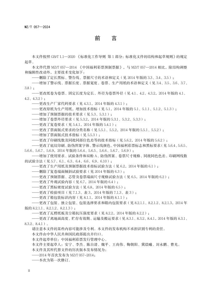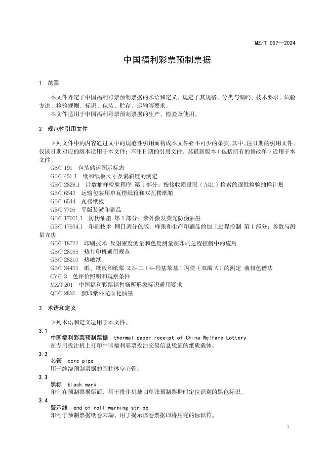 MZ/T 057-2024 中国福利彩票预制票据
