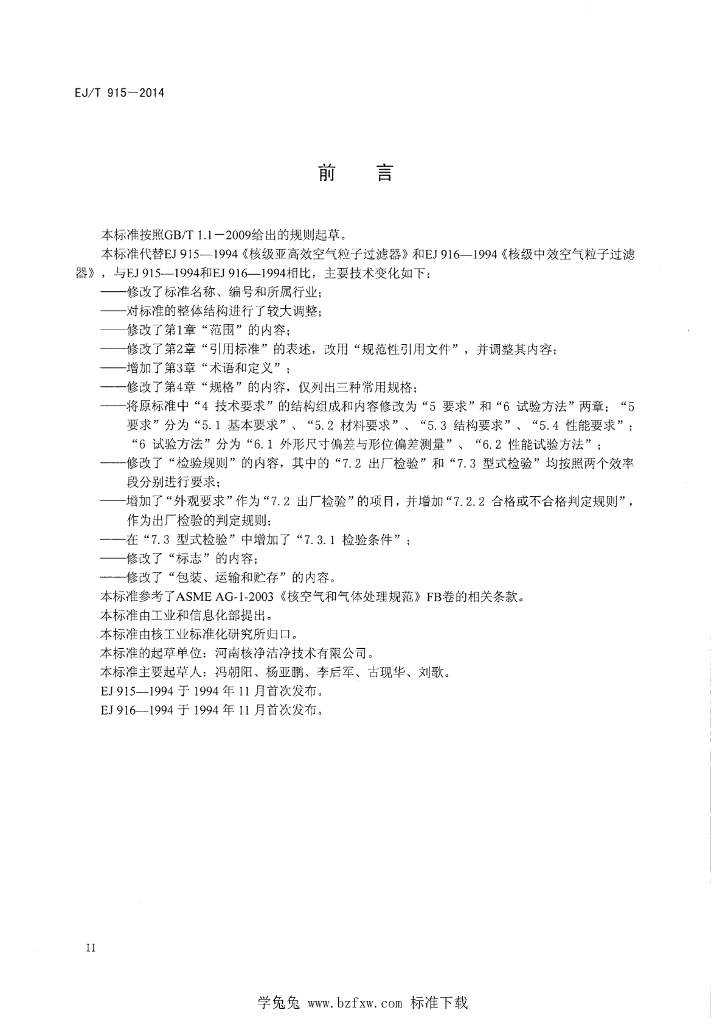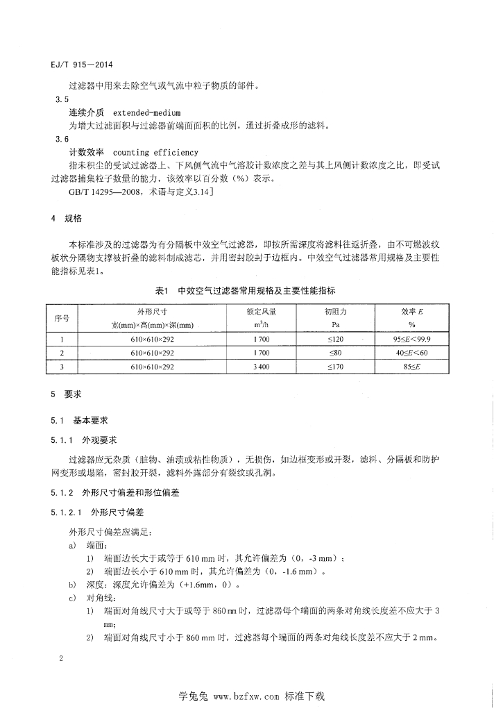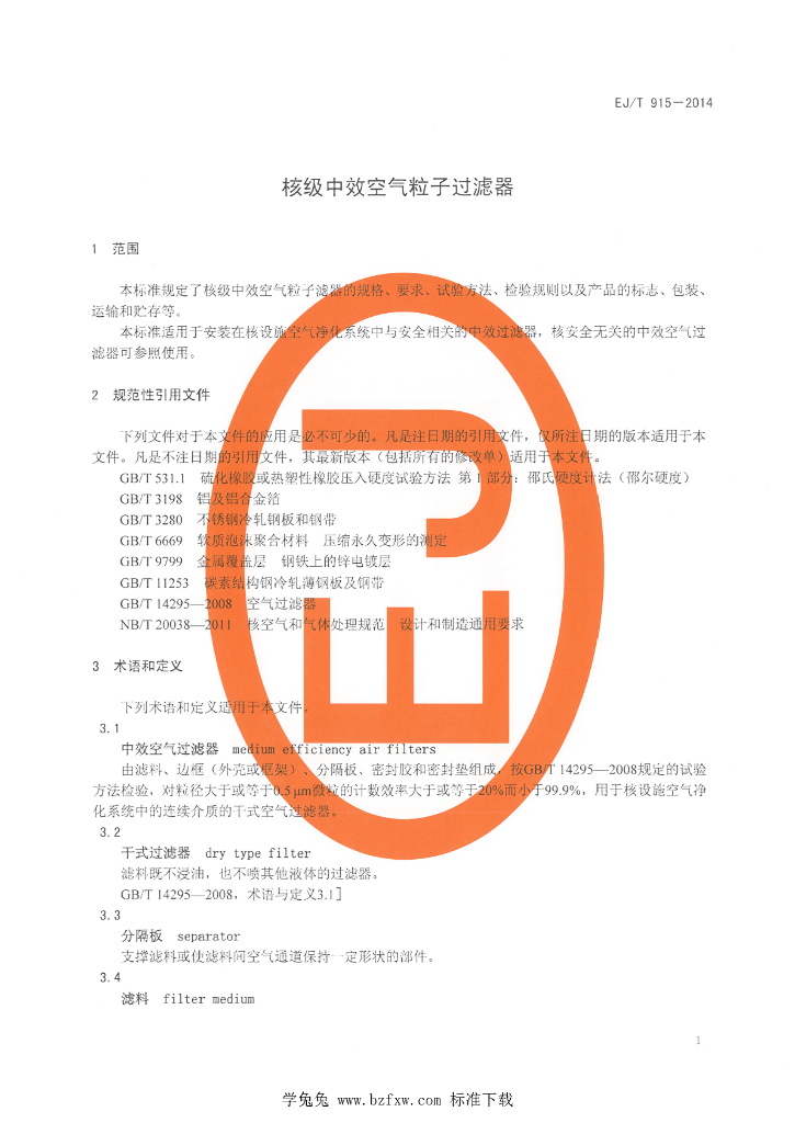 EJ/T 915-2014 核级中效空气粒子过滤器