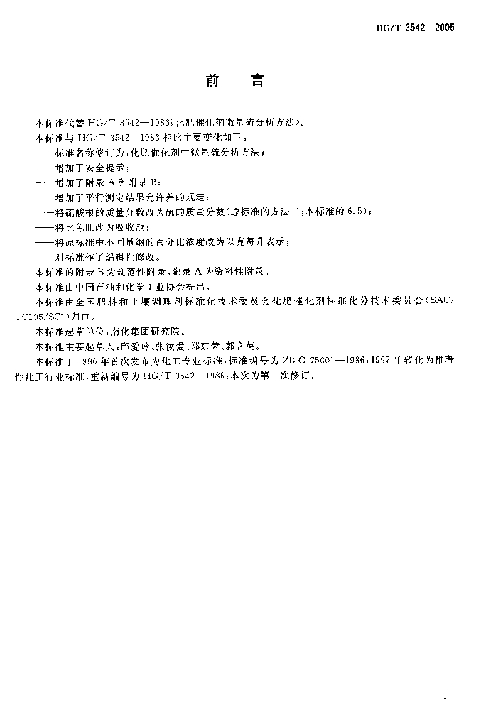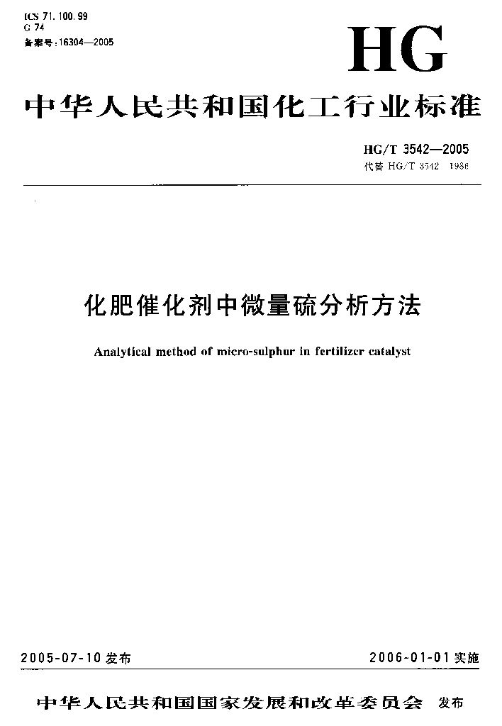 HG/T 3542-2005 代替 HG/T 3542-1986 化肥催化剂中微量硫分析方法