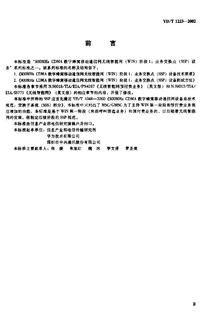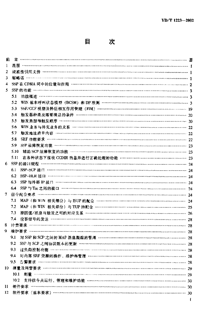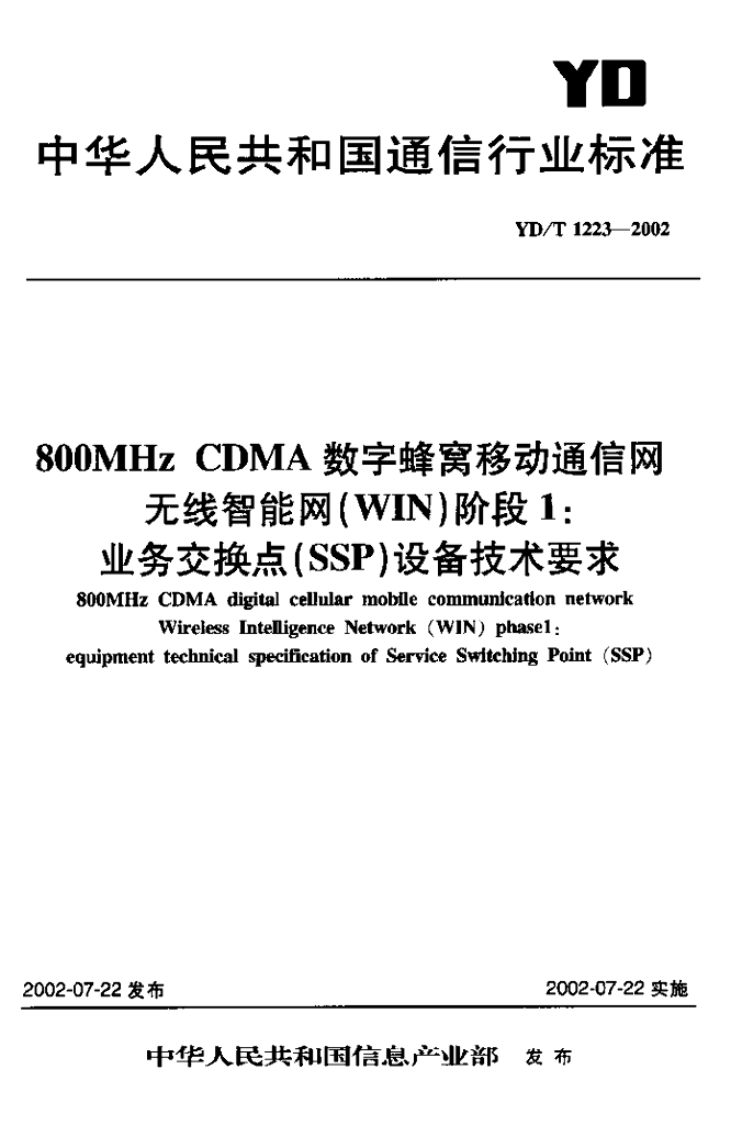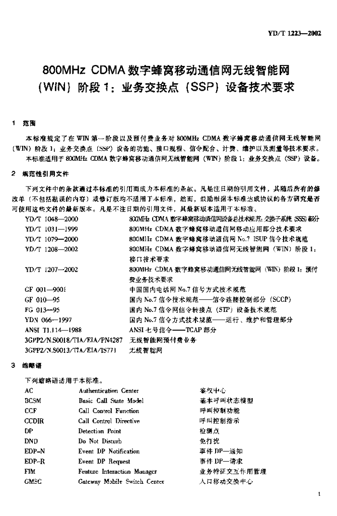 YD/T 1223-2002 800MHz CDMA 数字蜂窝移动通信网无线智能网(WIN)阶段1:业务交换点(SSP)设备技术要求