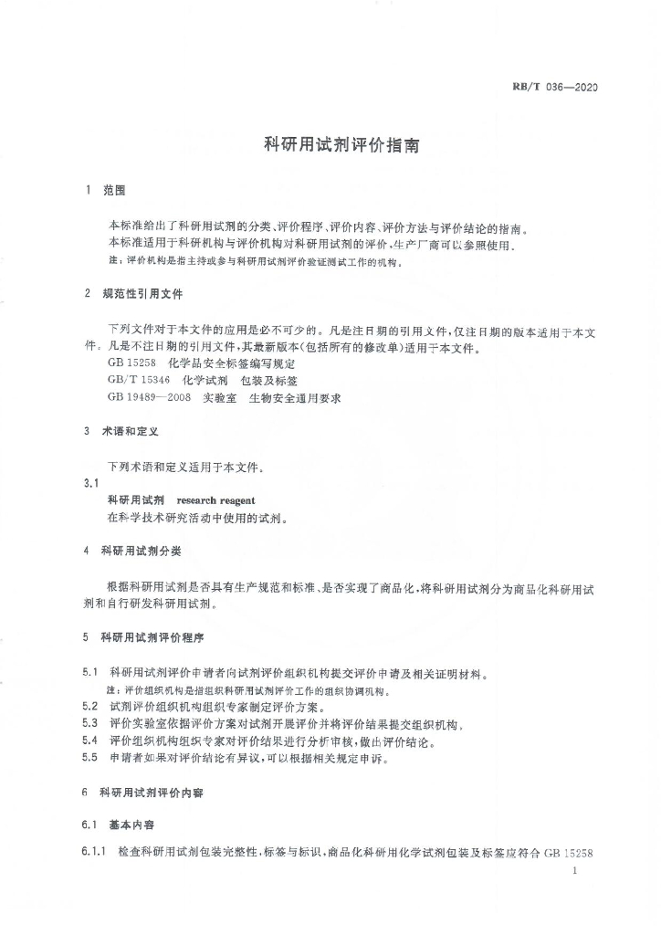 RB/T 036-2020 科研用试剂评价指南