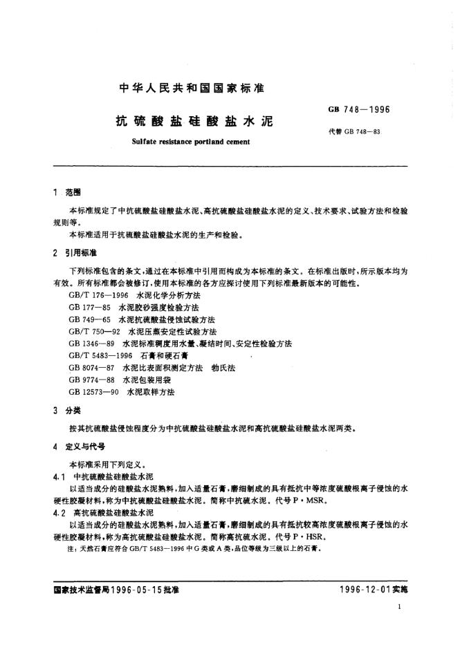 GB 748-1996 抗硫酸盐硅酸盐水泥