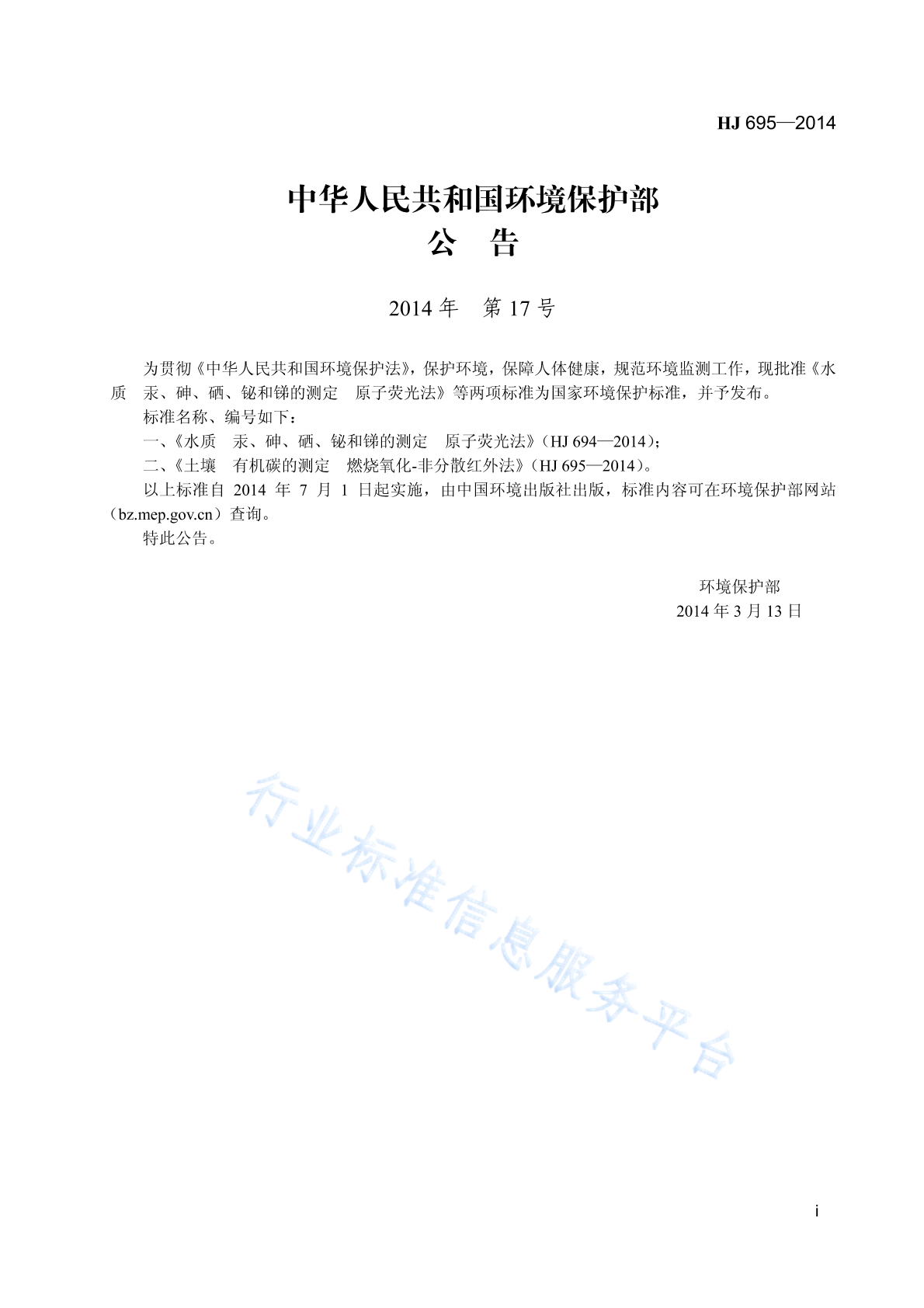 HJ 695-2014 土壤 有机碳的测定 燃烧氧化-非分散红外法