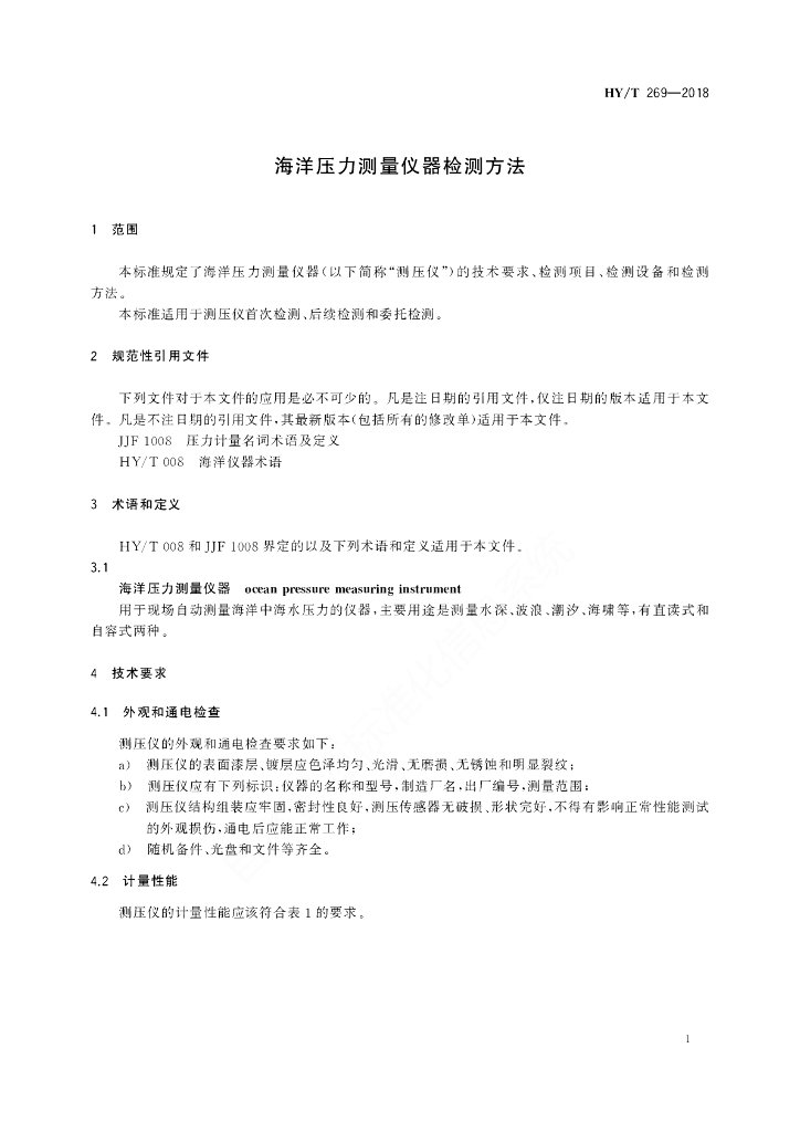 HY/T 269-2018 海洋压力测量仪器检测方法