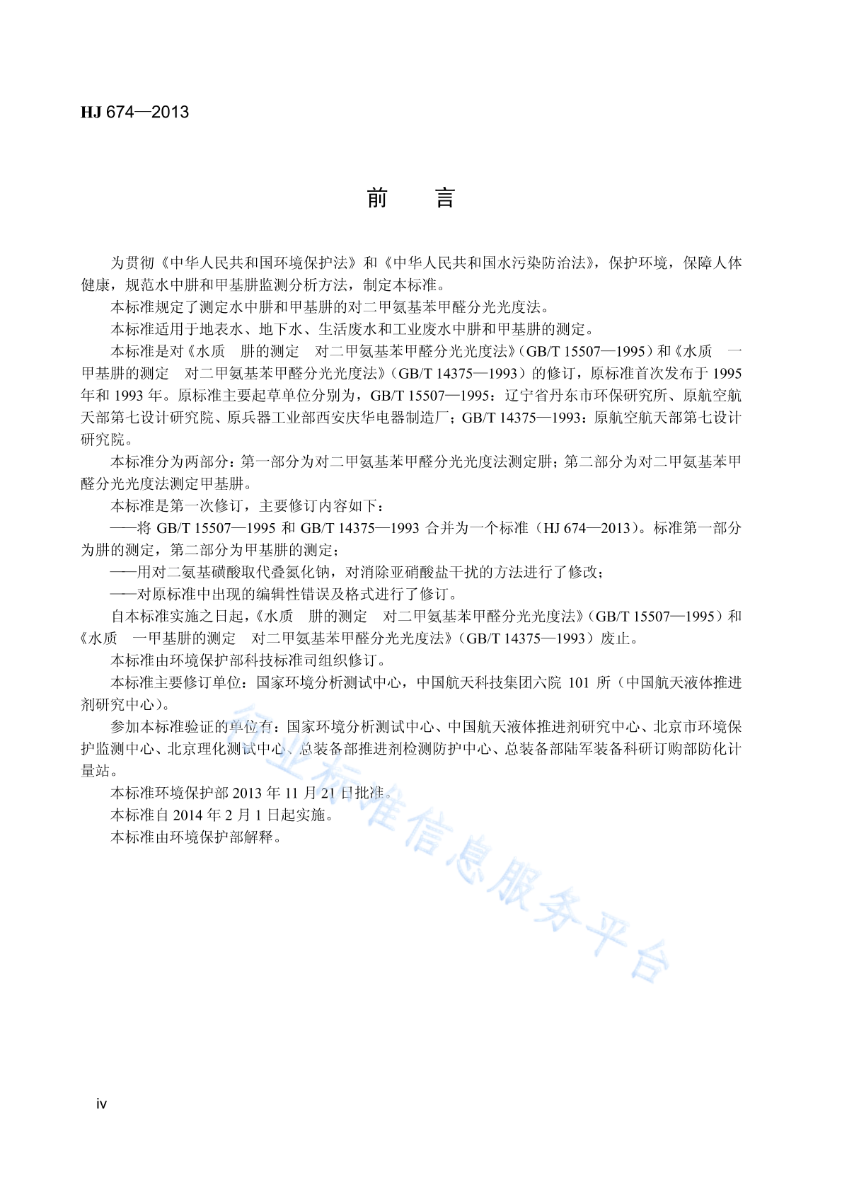 HJ 674-2013 水质 肼和甲基肼的测定 对二氨基苯甲醛分光光度法